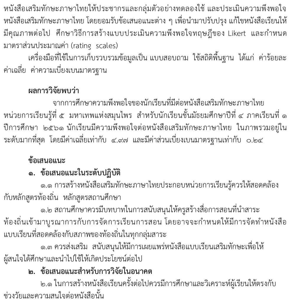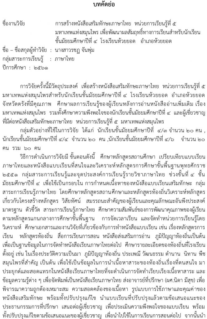 ชื่องานวิจัย : การสร้างหนังสือเสริมทักษะภาษาไทย หน่วยการเรียนรู้ที่ 5 มหาเทพแห่งสมุนไพร เพื่อพัฒนาผลสัมฤทธิ์ทางการเรียนสำหรับนักเรียนชั้นมัธยมศึกษาปีที่ 4 โรงเรียนห้วยยอด