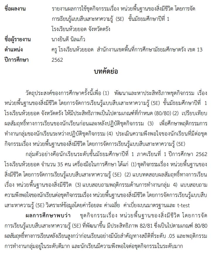 ชื่อผลงาน : รายงานผลการใช้ชุดกิจกรรมเรื่อง หน่วยพื้นฐานของสิ่งมีชีวิต โดยการจัดการเรียนรู้แบบสืบเสาะหาความรู้ (5E) ชั้นมัธยมศึกษาปีที่ 1 โรงเรียนห้วยยอด จังหวัดตรัง