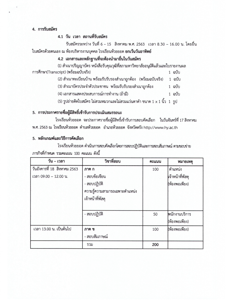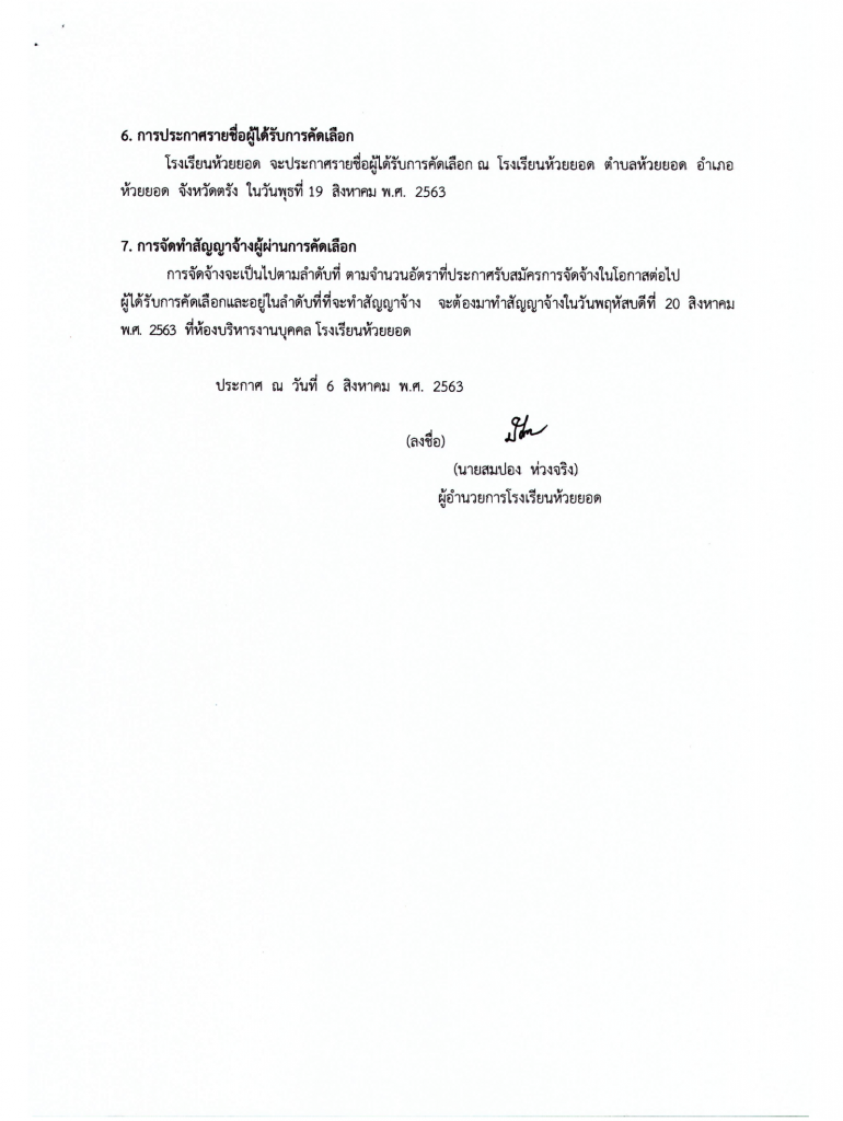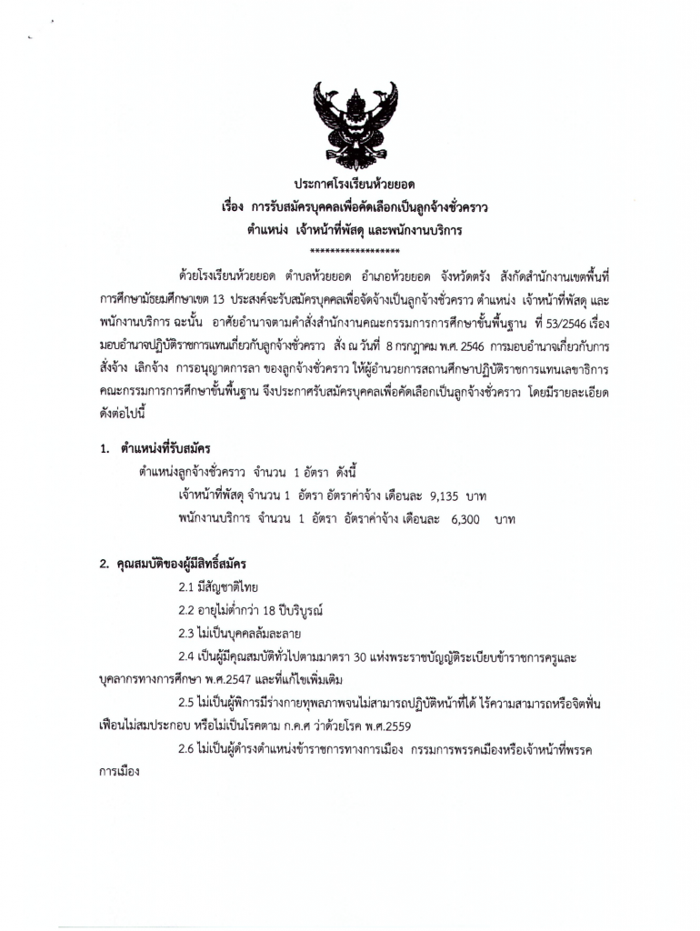 ประกาศโรงเรียนห้วยยอด เรื่องการรับสมัครบุคคลเพื่อคัดเลือกเป็นลูกจ้างชั่วคราว ตำแหน่ง เจ้าหน้าที่พัสดุ และ พนักงานบริการ