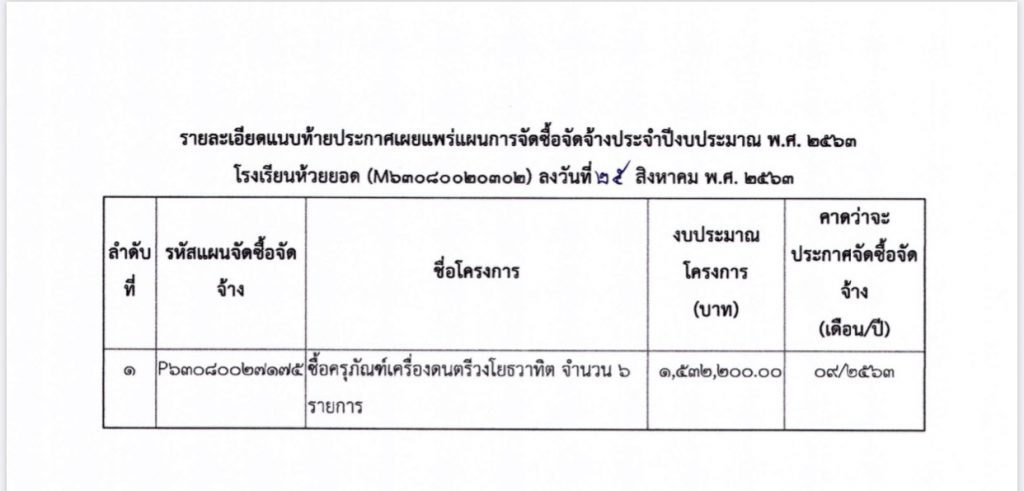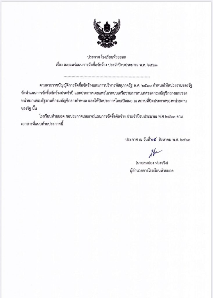 ประกาศโรงเรียนห้วยยอด เรื่อง เผยแพร่แผนการจัดซื้อจัดจ้าง ประจำปีงบประมาณ 2563