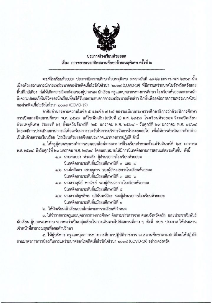 ประกาศโรงเรียนห้วยยอด เรื่อง การขยายเวลาปิดสถานศึกษาด้วยเหตุพิเศษ ครั้งที่ 2