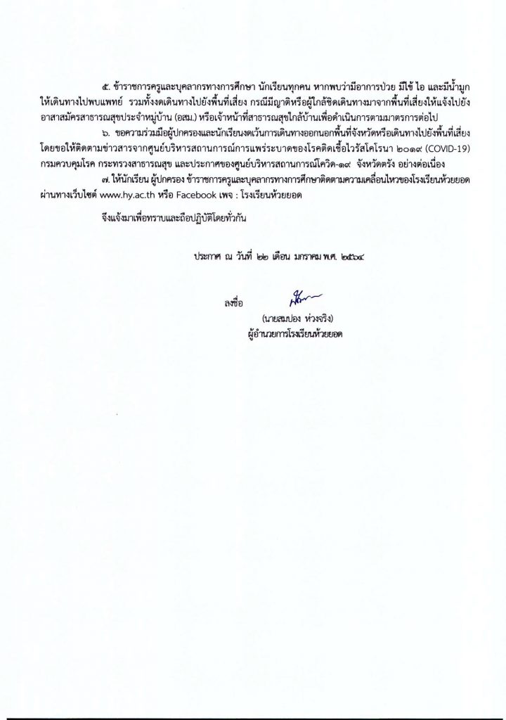 ประกาศโรงเรียนห้วยยอด เรื่อง การขยายเวลาปิดสถานศึกษาด้วยเหตุพิเศษ ครั้งที่ 2 ให้ครูผู้สอนทุกคนทำการสอนออนไลน์ตามตารางที่โรงเรียนกำหนดตั้งแต่วันจันทร์ที่ 25 มกราคม 2564 ถึง วันศุกร์ที่ 29 มกราคม 2564 และให้นักเรียนเข้าเรียนออนไลน์ตามตารางเรียนที่กำหนด