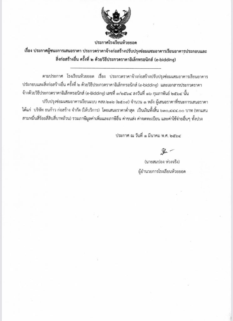 ประกาศโรงเรียนห้วยยอด เรื่อง ประกาศผู้ชนะการเสนอราคา ประกวดรคาจ้างก่อสร้างปรับปรุงซ่อมแชมอาคารเรียนอาคารประกอบและสิ่งก่อสร้างอื่น ครั้งที่ 2 ด้วยวิธีประกวดราคาอิเล็กทรอนิกส์ (e-bidding)