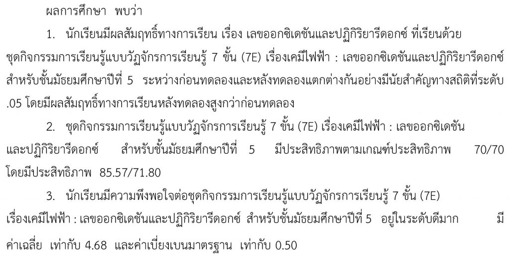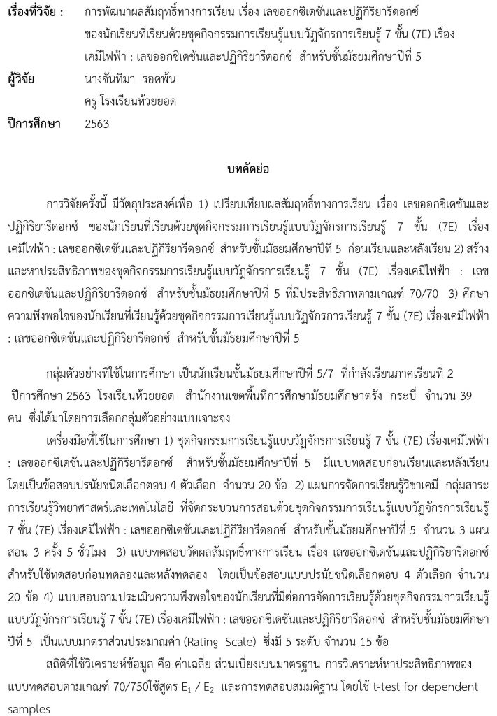 เรื่องที่วิจัย การพัฒนาผลสัมฤทธิ์ทางการเรียน เรื่อง เลขออกซิเดชันและปฏิกิริยารีดอกซ์ของนักเรียนที่เรียนด้วยชุดกิจกรรมการเรียนรู้แบบวัฏจักรการเรียนรู้ 7 ขั้นตอน (7E) เรื่อง เคมีไฟฟ้า : เลขออกซิเดชันและปฏิกิริยารีดอกซ์ สำหรับชั้นมัธยมศึกษาปีที่ 5