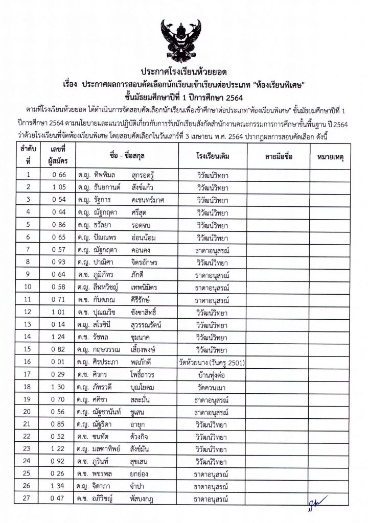 ประกาศผลการสอบคัดเลือกนักเรียนเข้าเรียนต่อประเภทห้องเรียนพิเศษ ม.1 ปีการศึกษา 2564