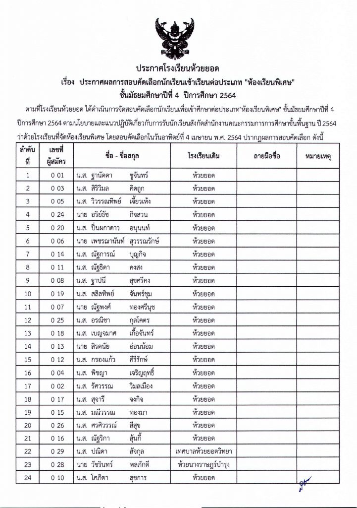 ประกาศผลการสอบคัดเลือกนักเรียนเข้าเรียนต่อประเภทห้องเรียนพิเศษ ม.1 และ ม.4 ปีการศึกษา 2564