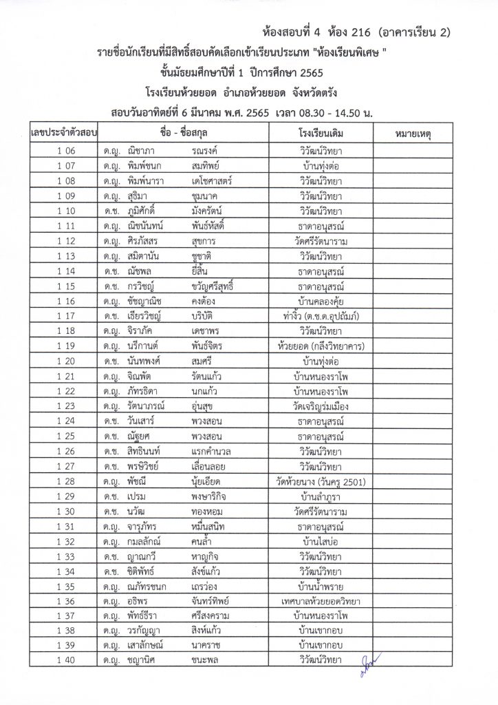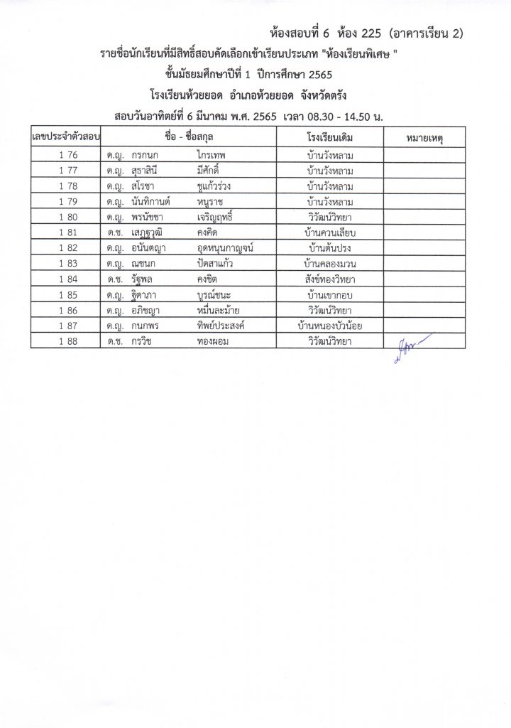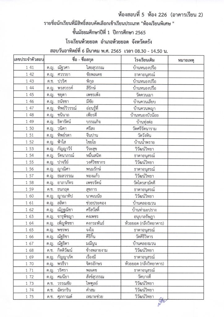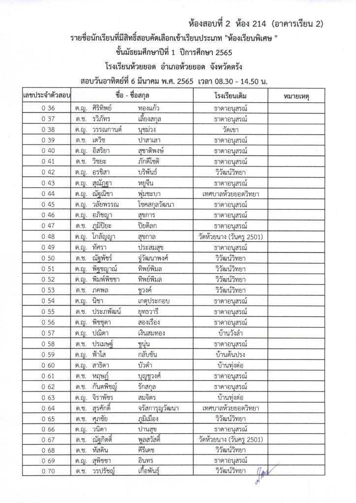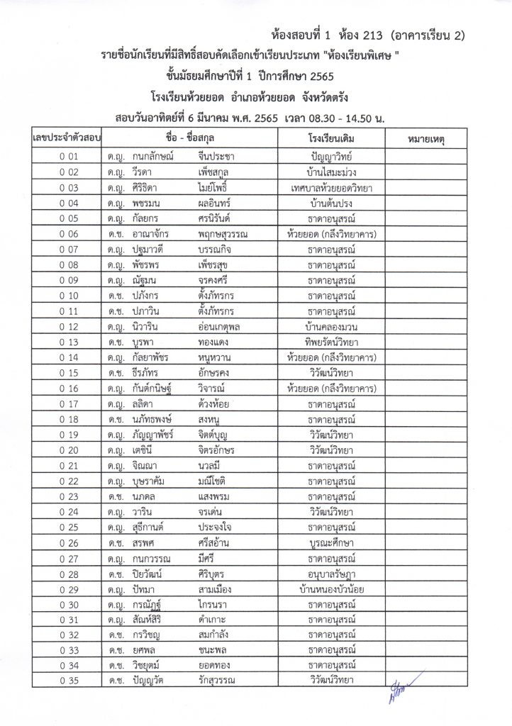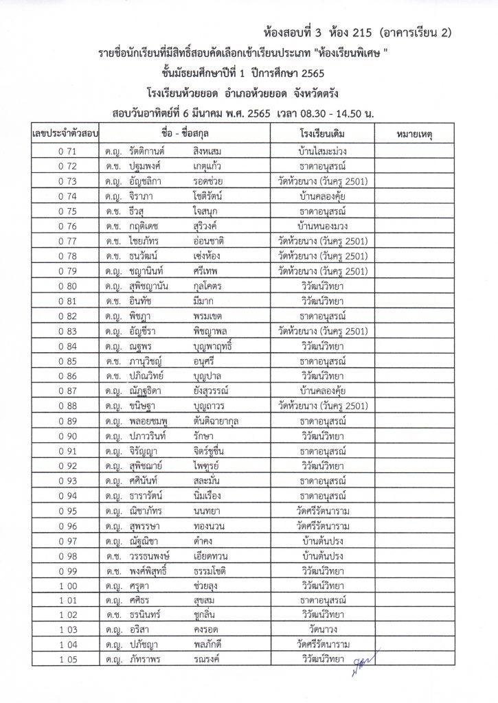 รายชื่อนักเรียนที่มีสิทธิ์สอบคัดเลือกเข้าเรียนประเภท “ห้องเรียนพิเศษ” ชั้นมัธยมศึกษาปีที่ 1 ปีการศึกษา 2565 โรงเรียนห้วยยอด อำเภอห้วยยอด จังหวัดตรัง