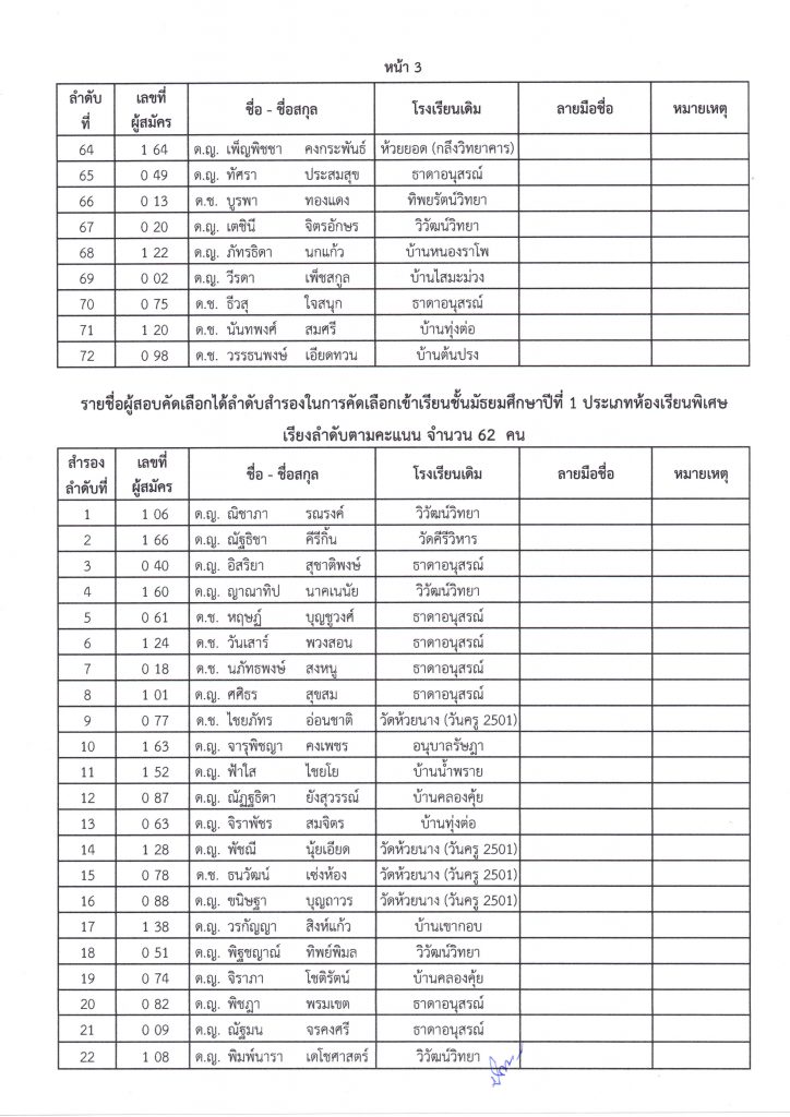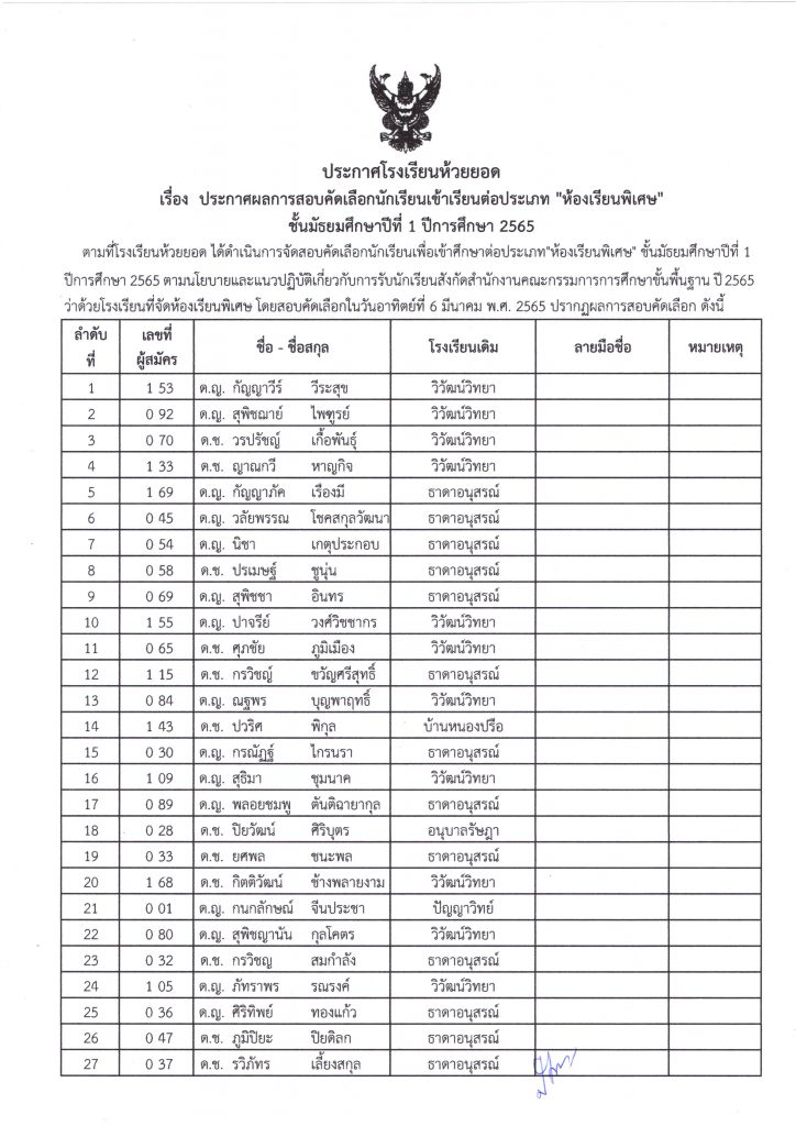 ไฟล์ผลการสอบคัดเลือกนักเรียนเข้าเรียนต่อประเภทห้องเรียนพิเศษ ชั้นมัธยมศึกษาปีที่ 1 ปีการศึกษา 2565