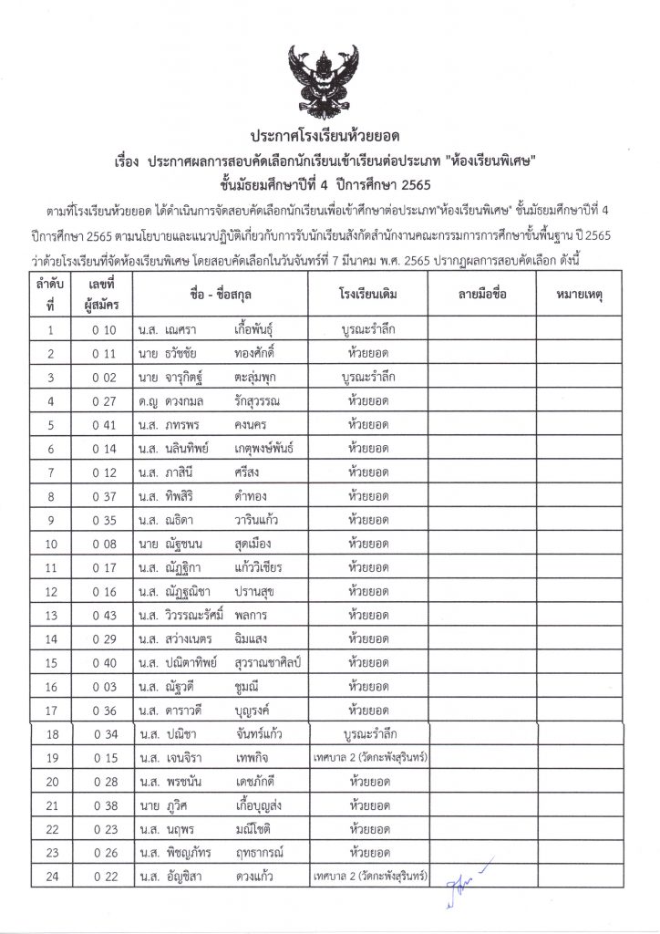 ประกาศผลการสอบคัดเลือกนักเรียนเข้าเรียนต่อประเภท “ห้องเรียนพิเศษ” ชั้นมัธยมศึกษาปีที่ 4 ปีการศึกษา 2565
