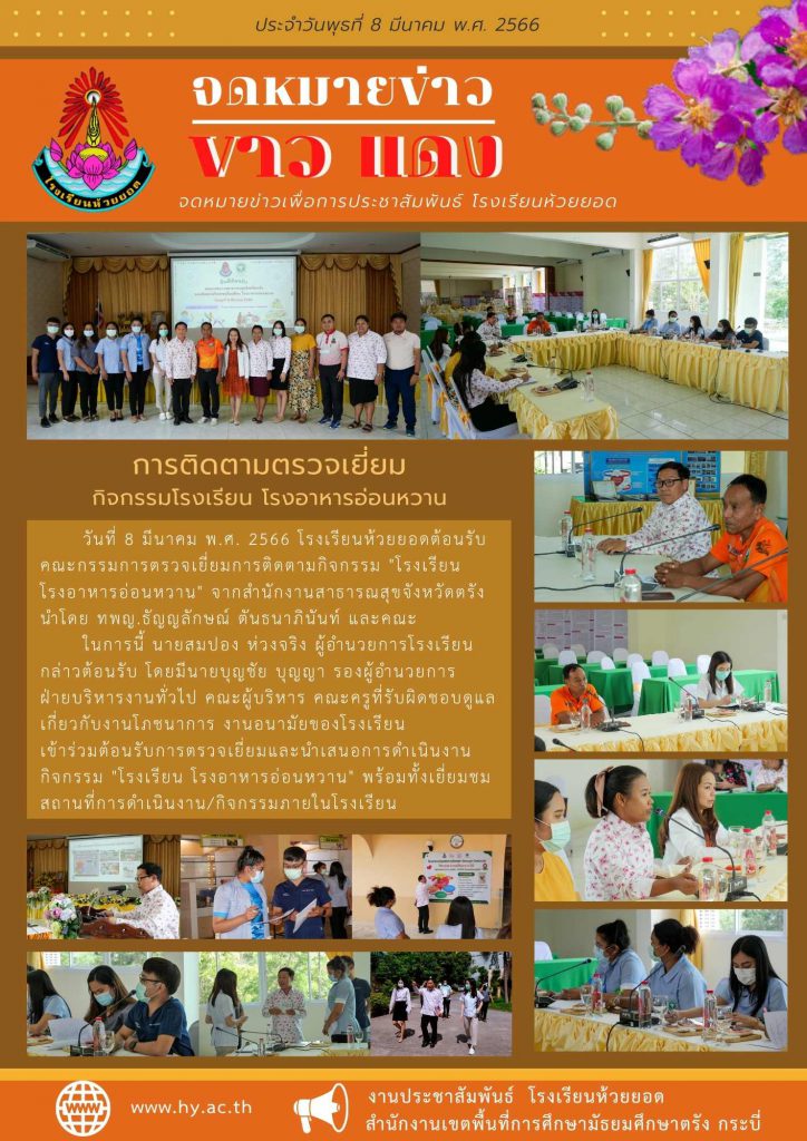 วันที่ 8 มีนาคม พ.ศ. 2566 โรงเรียนห้วยยอดต้อนรับคณะกรรมการตรวจเยี่ยมการติดตามกิจกรรม “โรงเรียน โรงอาหารอ่อนหวาน” จากสำนักงานสาธารณสุขจังหวัดตรัง นำโดย ทพญ.ธัญญลักษณ์ ตันธนาภินันท์ และคณะ ในการนี้ นายสมปอง ห่วงจริง ผู้อำนวยการโรงเรียนกล่าวต้อนรับ โดยมีนายบุญชัย บุญญา รองผู้อำนวยการ ฝ่ายบริหารงานทั่วไป คณะผู้บริหาร คณะครูที่รับผิดชอบดูแลเกี่ยวกับงานโภชนาการ งานอนามัยของโรงเรียนเข้าร่วมต้อนรับการตรวจเยี่ยมและนำเสนอการดำเนินงานกิจกรรม “โรงเรียน โรงอาหารอ่อนหวาน” พร้อมทั้งเยี่ยมชมสถานที่การดำเนินงาน/กิจกรรมภายในโรงเรียน