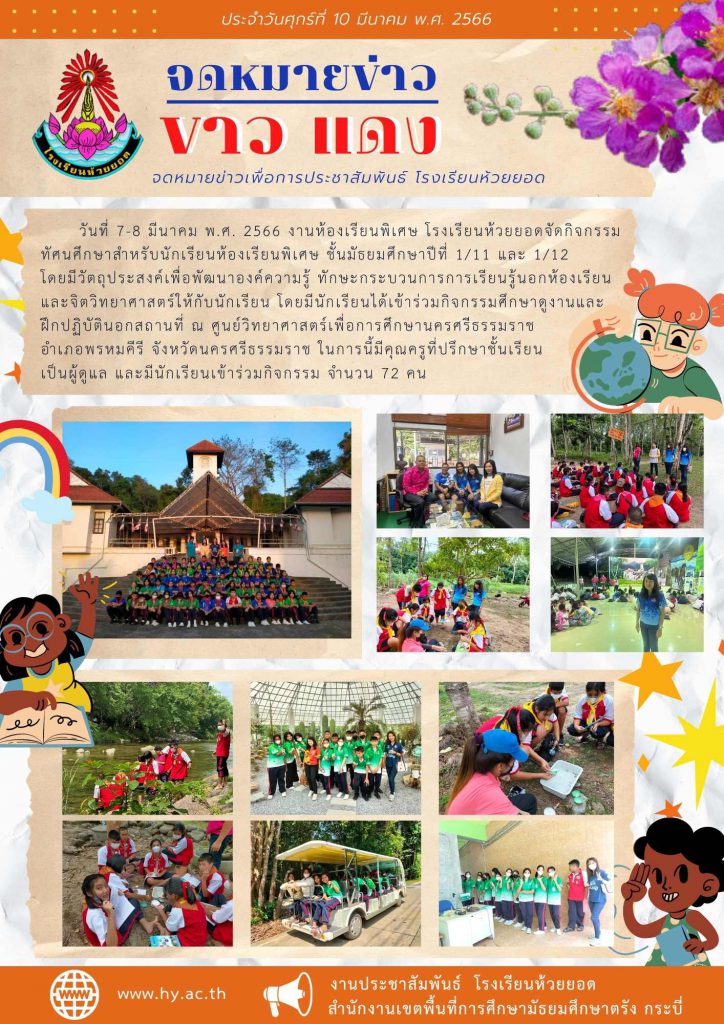 วันที่ 7-8 มีนาคม พ.ศ. 2566 งานห้องเรียนพิเศษ โรงเรียนห้วยยอดจัดกิจกรรมทัศนศึกษาสำหรับนักเรียนห้องเรียนพิเศษ ชั้นมัธยมศึกษาปีที่ 1/11 และ 1/12 โดยมีวัตถุประสงค์เพื่อพัฒนาองค์ความรู้ ทักษะกระบวนการการเรียนรู้นอกห้องเรียนและจิตวิทยาศาสตร์ให้กับนักเรียน โดยมีนักเรียนได้เข้าร่วมกิจกรรมศึกษาดูงานและ ฝึกปฏิบัตินอกสถานที่ ณ ศูนย์วิทยาศาสตร์เพื่อการศึกษานครศรีธรรมราช อำเภอพรหมคีรี จังหวัดนครศรีธรรมราช ในการนี้มีคุณครูที่ปรึกษาชั้นเรียน เป็นผู้ดูแล และมีนักเรียนเข้าร่วมกิจกรรม จำนวน 72 คน