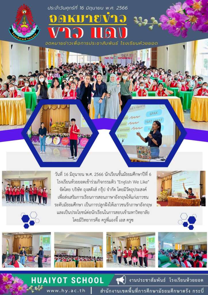 วันที่ 16 มิถุนายน พ.ศ. 2566 นักเรียนชั้นมัธยมศึกษาปีที่ 6 โรงเรียนห้วยยอดเข้าร่วมกิจกรรมติว “English We Like” จัดโดย บริษัท ถุงสตังส์ กรุ๊ป จำกัด โดยมีวัตถุประสงค์ เพื่อส่งเสริมการเรียนการสอนภาษาอังกฤษให้แก่เยาวชน ระดับมัธยมศึกษา เป็นการปลูกฝังให้เยาวชนรักภาษาอังกฤษและเป็นประโยชน์ต่อนักเรียนในการสอบเข้ามหาวิทยาลัย โดยมีวิทยากรคือ ครูพี่แองจี้ เอส ครูซ