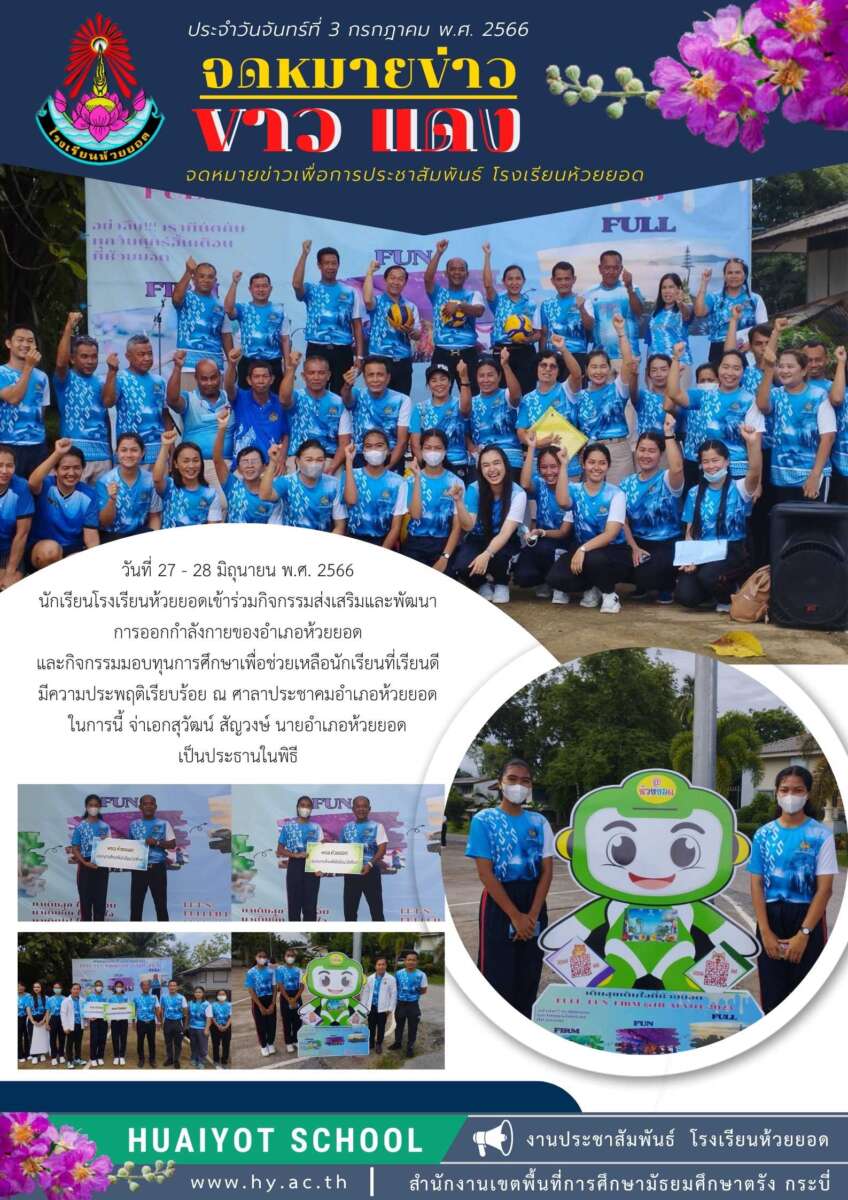 วันที่ 27 – 28 มิถุนายน พ.ศ. 2566 นักเรียนโรงเรียนห้วยยอดเข้าร่วมกิจกรรมส่งเสริมและพัฒนาการออกกำลังกายของอำเภอห้วยยอดและกิจกรรมมอบทุนการศึกษาเพื่อช่วยเหลือนักเรียนที่เรียนดีมีความประพฤติเรียบร้อย ณ ศาลาประชาคมอำเภอห้วยยอด ในการนี้ จ่าเอกสุวัฒน์ สัญวงษ์ นายอำเภอห้วยยอดเป็นประธานในพิธี