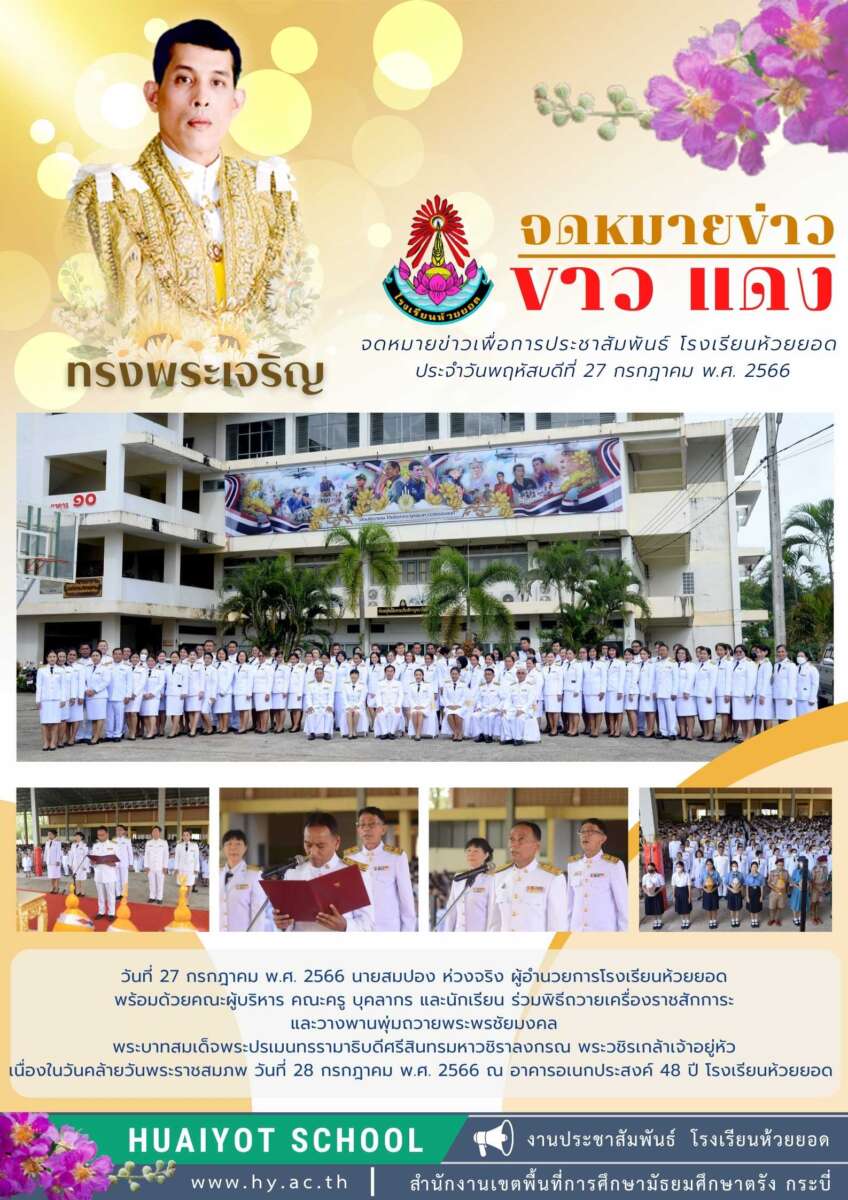 วันที่ 27 กรกฎาคม พ.ศ. 2566 นายสมปอง ห่วงจริง ผู้อำนวยการโรงเรียนห้วยยอด พร้อมด้วยคณะผู้บริหาร คณะครู บุคลากร และนักเรียน ร่วมพิธีถวายเครื่องราชสักการะ
