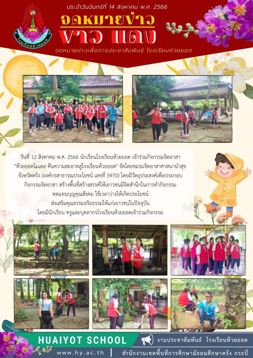 วันที่ 12 สิงหาคม พ.ศ. 2566 นักเรียนโรงเรียนห้วยยอด เข้าร่วมกิจกรรมจิตอาสา “ห้วยยอดโมเดล คืนความสะอาดสู่โรงเรียนห้วยยอด” จัดโดยชมรมจิตอาสาศาสนานำสุขจังหวัดตรัง (องค์กรสาธารณประโยชน์ เลขที่ 5970) โดยมีวัตถุประสงค์เพื่อประกอบกิจกรรมจิตอาสา สร้างพื้นที่สร้างสรรค์ให้เยาวชนมีจิตสำนึกในการทำกิจกรรมทดแทนบุญคุณสังคม ใช้เวลาว่างให้เกิดประโยชน์ส่งเสริมคุณธรรมจริยธรรมให้แก่เยาวชนในปัจจุบัน โดยมีนักเรียน ครูและบุคลากรโรงเรียนห้วยยอดเข้าร่วมกิจกรรม