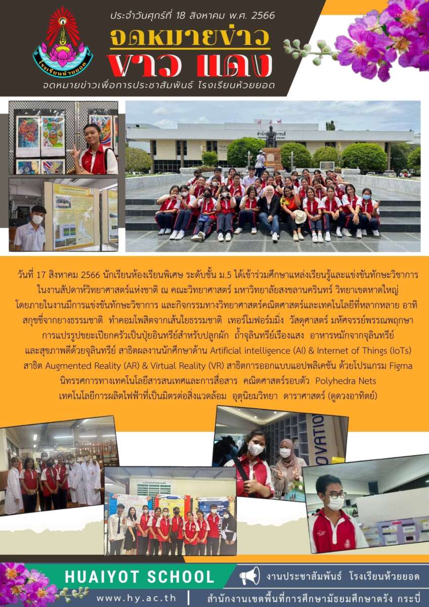 วันที่ 17 สิงหาคม 2566 นักเรียนห้องเรียนพิเศษ ระดับชั้น ม.5 ได้เข้าร่วมศึกษาแหล่งเรียนรู้และแข่งขันทักษะวิชาการในงานสัปดาห์วิทยาศาสตร์แห่งชาติ ณ คณะวิทยาศาสตร์ มหาวิทยาลัยสงขลานครินทร์ วิทยาเขตหาดใหญ่ โดยภายในงานมีการแข่งขันทักษะวิชาการ และกิจกรรมทางวิทยาศาสตร์คณิตศาสตร์และเทคโนโลยีที่หลากหลาย อาทิ สกุชชี่จากยางธรรมชาติ ทำคอมโพสิตจากเส้นใยธรรมชาติ เทอร์โมฟอร์มมิ่ง วัสดุศาสตร์ มหัศจรรย์พรรณพฤกษา การแปรรูปขยะเปียกครัวเป็นปุ๋ยอินทรีย์สำหรับปลูกผัก ถ้ำจุลินทรีย์เรืองแสง อาหารหมักจากจุลินทรีย์ และสุขภาพดีด้วยจุลินทรีย์ สาธิตผลงานนักศึกษาด้าน Artificial intelligence (AI) & Internet of Things (IoTs) สาธิต Augmented Reality (AR) & Virtual Reality (VR) สาธิตการออกแบบแอปพลิเคชัน ด้วยโปรแกรม Figmaนิทรรศการทางเทคโนโลยีสารสนเทศและการสื่อสาร คณิตศาสตร์รอบตัว Polyhedra Nets เทคโนโลยีการผลิตไฟฟ้าที่เป็นมิตรต่อสิ่งแวดล้อม อุตุนิยมวิทยา ดาราศาสตร์ (ดูดวงอาทิตย์)