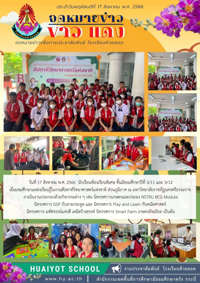 วันที่ 17 สิงหาคม พ.ศ. 2566 นักเรียนห้องเรียนพิเศษ ชั้นมัธยมศึกษาปีที่ 3/11 และ 3/12 เยี่ยมชมศึกษาแหล่งเรียนรู้ในงานสัปดาห์วิทยาศาสตร์แห่งชาติ ส่วนภูมิภาค ณ มหาวิทยาลัยราชภัฏนครศรีธรรมราช ภายในงานประกอบด้วยกิจกรรมต่าง ๆ เช่น นิทรรศการเกษตรและประมง NSTRU BCG Module นิทรรศการ GSP กับลายกระจูด และ นิทรรศการ Play and Learn กับคณิตศาสตร์ นิทรรศการ มหัศจรรย์แห่งสี เคมีสร้างสรรค์ นิทรรศการ Smart Farm เกษตรอัจฉริยะ เป็นต้น