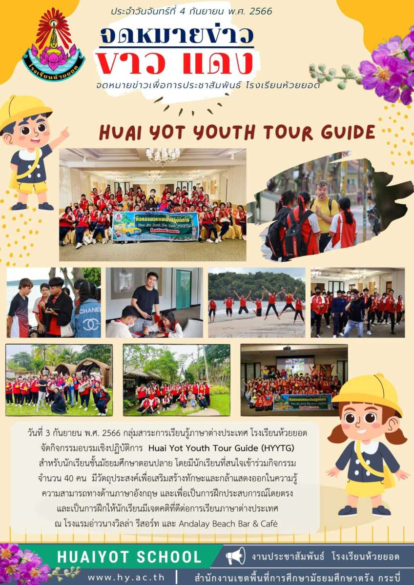 วันที่ 3 กันยายน พ.ศ. 2566 กลุ่มสาระการเรียนรู้ภาษาต่างประเทศ โรงเรียนห้วยยอดจัดกิจกรรมอบรมเชิงปฏิบัติการ Huai Yot Youth Tour Guide (HYYTG) สำหรับนักเรียนชั้นมัธยมศึกษาตอนปลาย โดยมีนักเรียนที่สนใจเข้าร่วมกิจกรรม จำนวน 40 คน มีวัตถุประสงค์เพื่อเสริมสร้างทักษะและกล้าแสดงออกในความรู้ ความสามารถทางด้านภาษาอังกฤษ และเพื่อเป็นการฝึกประสบการณ์โดยตรง และเป็นการฝึกให้นักเรียนมีเจตคติที่ดีต่อการเรียนภาษาต่างประเทศ ณ โรงแรมอ่าวนางวิลล่า รีสอร์ท และ Andalay Beach Bar & Café