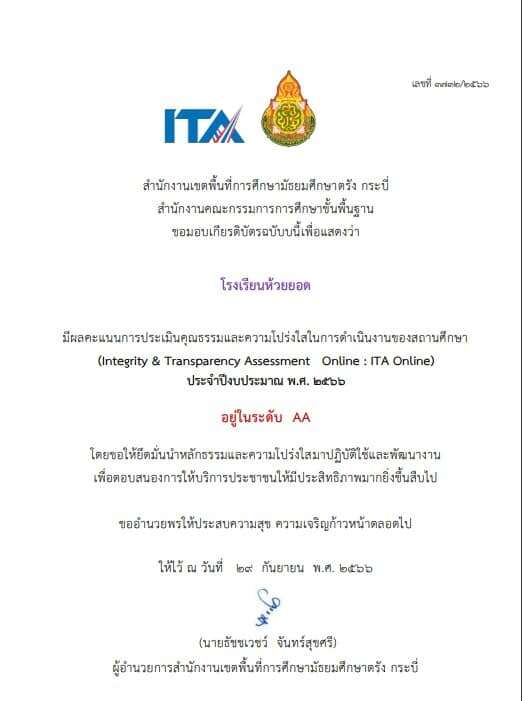 โรงเรียนห้วยยอด มีผลคะแนนประเมินคุณธรรมและความโปร่งใสในการดำเนินงานของสถานศึกษา ประจำปีงบประมาณ 2566 อยู่ในระดับ AA ประกาศผลการประเมินคุณธรรมและความโปร่งใสในการดำเนินงานของสถานศึกษาออนไลน์ (ITA Online) ประจำปีงบประมาณ 2566