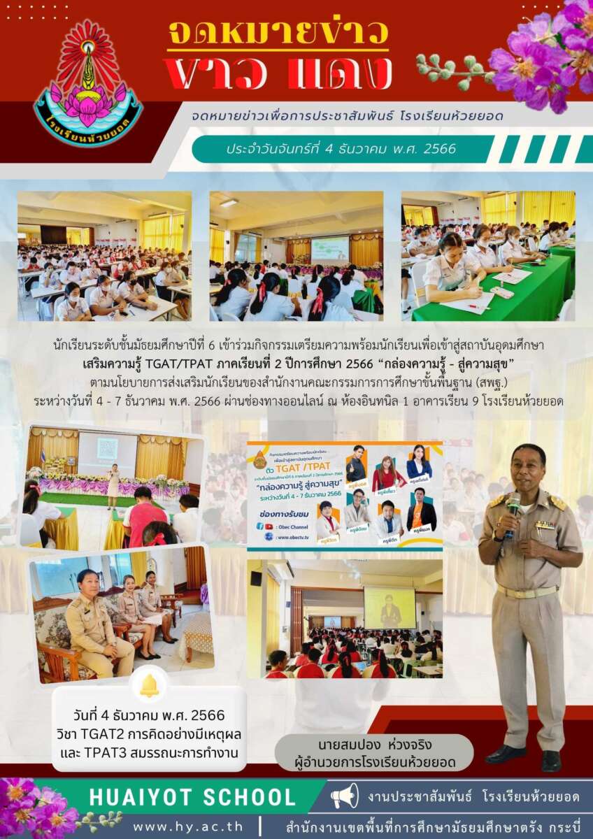 นักเรียนระดับชั้นมัธยมศึกษาปีที่ 6 เข้าร่วมกิจกรรมเตรียมความพร้อมนักเรียนเพื่อเข้าสู่สถาบันอุดมศึกษา เสริมความรู้ TGAT/TPAT ภาคเรียนที่ 2 ปีการศึกษา 2566 “กล่องความรู้ – สู่ความสุข” ตามนโยบายการส่งเสริมนักเรียนของสำนักงานคณะกรรมการการศึกษาขั้นพื้นฐาน (สพฐ.) ระหว่างวันที่ 4 – 7 ธันวาคม พ.ศ. 2566 ผ่านช่องทางออนไลน์ ณ ห้องอินทนิล 1 อาคารเรียน 9 โรงเรียนห้วยยอด