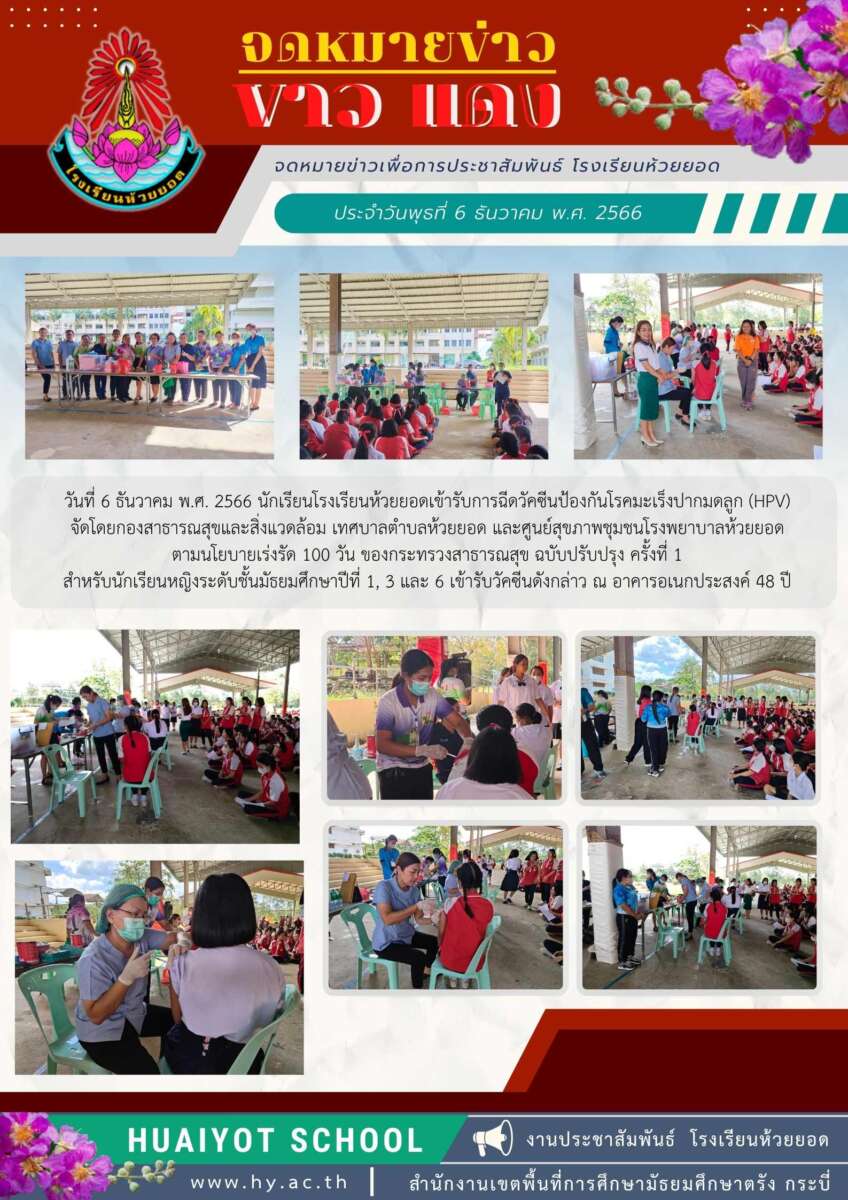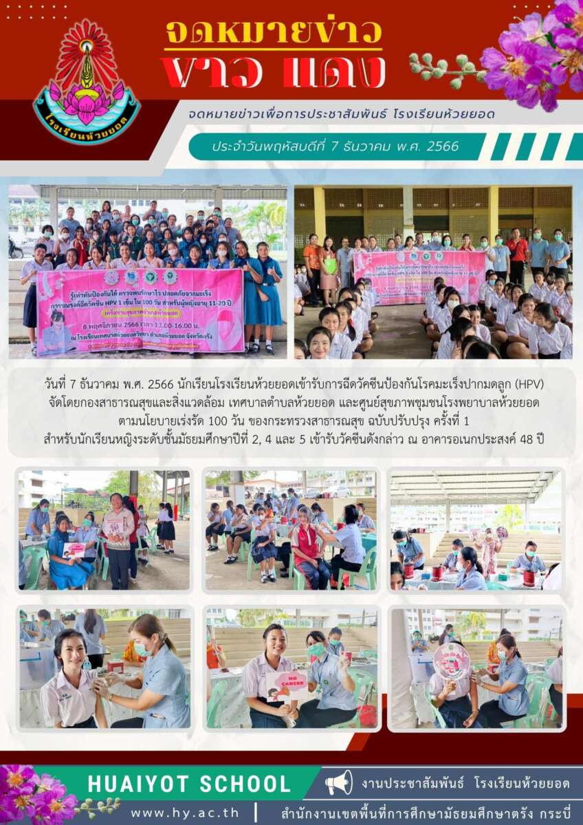 วันที่ 6-7 ธันวาคม พ.ศ. 2566 นักเรียนโรงเรียนห้วยยอดเข้ารับการฉีดวัคซีนป้องกันโรคมะเร็งปากมดลูก (HPV) จัดโดยกองสาธารณสุขและสิ่งแวดล้อม เทศบาลตำบลห้วยยอด และศูนย์สุขภาพชุมชนโรงพยาบาลห้วยยอด ตามนโยบายเร่งรัด 100 วัน ของกระทรวงสาธารณสุข ฉบับปรับปรุง ครั้งที่ 1 สำหรับนักเรียนหญิงเข้ารับวัคซีนดังกล่าว ณ อาคารอเนกประสงค์ 48 ปี