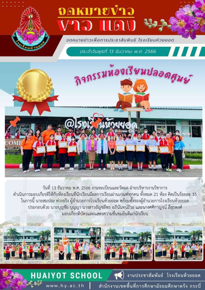 วันที่ 13 ธันวาคม พ.ศ. 2566 งานทะเบียนและวัดผล ฝ่ายบริหารงานวิชาการดำเนินการมอบเกียรติให้กับห้องเรียนที่นักเรียนมีผลการเรียนผ่านเกณฑ์ทุกคน ทั้งหมด 21 ห้อง คิดเป็นร้อยละ 35 ในการนี้ นายสมปอง ห่วงจริง ผู้อำนวยการโรงเรียนห้วยยอด พร้อมทั้งรองผู้อำนวยการโรงเรียนห้วยยอด ประกอบด้วย นายบุญชัย บุญญา นางสาวอัญชลีพร อภินันทน์ถิระ และนางศศิกาญจน์ ลีสุรพงศ์ มอบเกียรติบัตรและแสดงความชื่นชมยินดีแก่นักเรียน