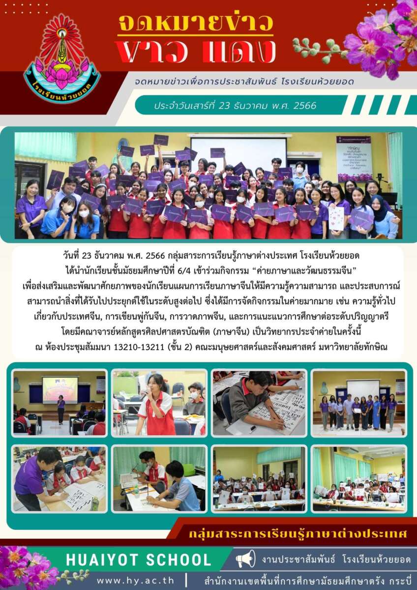 วันที่ 23 ธันวาคม พ.ศ. 2566 กลุ่มสาระการเรียนรู้ภาษาต่างประเทศ โรงเรียนห้วยยอด ได้นำนักเรียนชั้นมัธยมศึกษาปีที่ 6/4 เข้าร่วมกิจกรรม “ค่ายภาษาและวัฒนธรรมจีน” เพื่อส่งเสริมและพัฒนาศักยภาพของนักเรียนแผนการเรียนภาษาจีนให้มีความรู้ความสามารถ และประสบการณ์ สามารถนำสิ่งที่ได้รับไปประยุกต์ใช้ในระดับสูงต่อไป ซึ่งได้มีการจัดกิจกรรมในค่ายมากมาย เช่น ความรู้ทั่วไป เกี่ยวกับประเทศจีน, การเขียนพู่กันจีน, การวาดภาพจีน, และการแนะแนวการศึกษาต่อระดับปริญญาตรีโดยมีคณาจารย์หลักสูตรศิลปศาสตรบัณฑิต (ภาษาจีน) เป็นวิทยากรประจำค่ายในครั้งนี้ ณ ห้องประชุมสัมมนา 13210-13211 (ชั้น 2) คณะมนุษยศาสตร์และสังคมศาสตร์ มหาวิทยาลัยทักษิณ