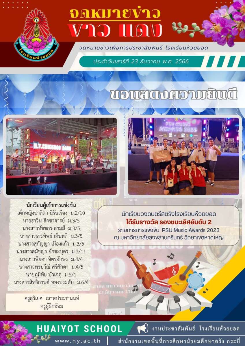 นักเรียนวงดนตรีสตริงโรงเรียนห้วยยอด ได้รับรางวัล รองชนะเลิศอันดับ 2 รายการการแข่งขัน PSU Music Awards 2023 ณ มหาวิทยาลัยสงขลานครินทร์ วิทยาเขตหาดใหญ่