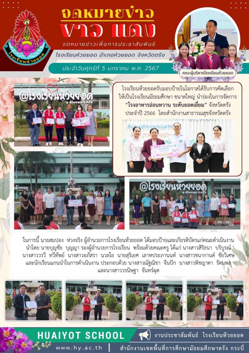 โรงเรียนห้วยยอดได้รับการคัดเลือกให้เป็นโรงเรียนมัธยมศึกษา ขนาดใหญ่ นำร่องในการจัดการ “โรงอาหารอ่อนหวาน ระดับยอดเยี่ยม”