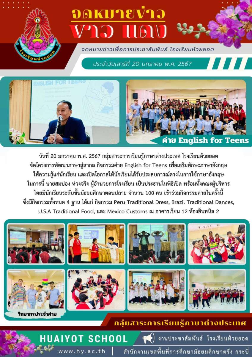 วันที่ 20 มกราคม พ.ศ. 2567 กลุ่มสาระการเรียนรู้ภาษาต่างประเทศ โรงเรียนห้วยยอดจัดโครงการพัฒนาภาษาสู่สากล กิจกรรมค่าย English for Teens เพื่อเสริมทักษะภาษาอังกฤษให้ความรู้แก่นักเรียน และเปิดโอกาสให้นักเรียนได้รับประสบการณ์ตรงในการใช้ภาษาอังกฤษ ในการนี้ นายสมปอง ห่วงจริง ผู้อำนวยการโรงเรียน เป็นประธานในพิธีเปิด พร้อมทั้งคณะผู้บริหาร โดยมีนักเรียนระดับชั้นมัธยมศึกษาตอนปลาย จำนวน 100 คน เข้าร่วมกิจกรรมค่ายในครั้งนี้ ซึ่งมีกิจกรรมทั้งหมด 4 ฐาน ได้แก่ กิจกรรม Peru Traditional Dress, Brazil Traditional Dances,U.S.A Traditional Food, และ Mexico Customs ณ อาคารเรียน 12 ห้องอินทนิล 2