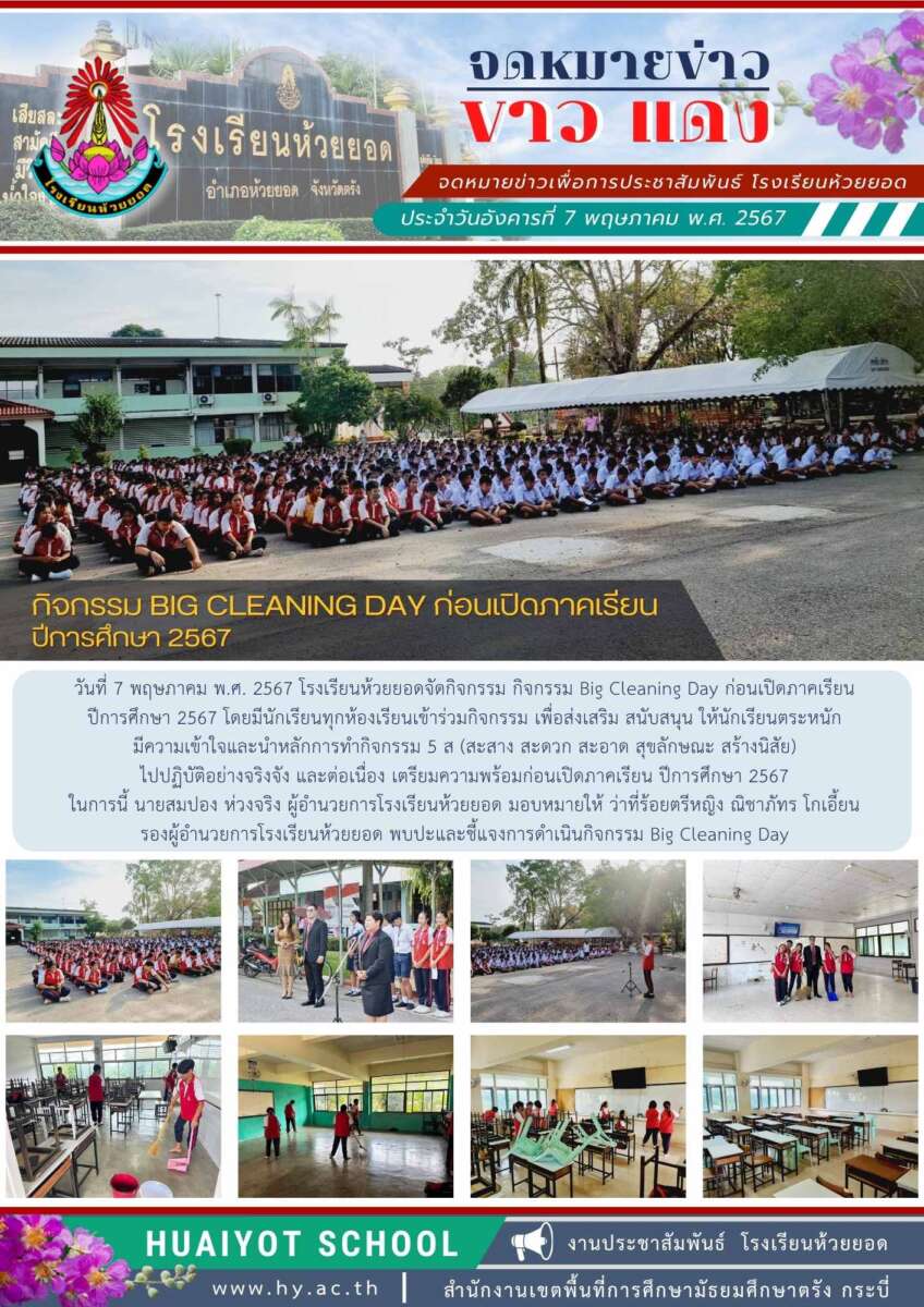 วันที่ 7 พฤษภาคม พ.ศ. 2567 โรงเรียนห้วยยอดจัดกิจกรรม กิจกรรม Big Cleaning Day ก่อนเปิดภาคเรียนปีการศึกษา 2567 โดยมีนักเรียนทุกห้องเรียนเข้าร่วมกิจกรรม เพื่อส่งเสริม สนับสนุน ให้นักเรียนตระหนักมีความเข้าใจและนำหลักการทำกิจกรรม 5 ส (สะสาง สะดวก สะอาด สุขลักษณะ สร้างนิสัย) ไปปฏิบัติอย่างจริงจัง และต่อเนื่อง เตรียมความพร้อมก่อนเปิดภาคเรียน ปีการศึกษา 2567 ในการนี้ นายสมปอง ห่วงจริง ผู้อำนวยการโรงเรียนห้วยยอด มอบหมายให้ ว่าที่ร้อยตรีหญิง ณิชาภัทร โกเอี้ยน รองผู้อำนวยการโรงเรียนห้วยยอด พบปะและชี้แจงการดำเนินกิจกรรม Big Cleaning Day