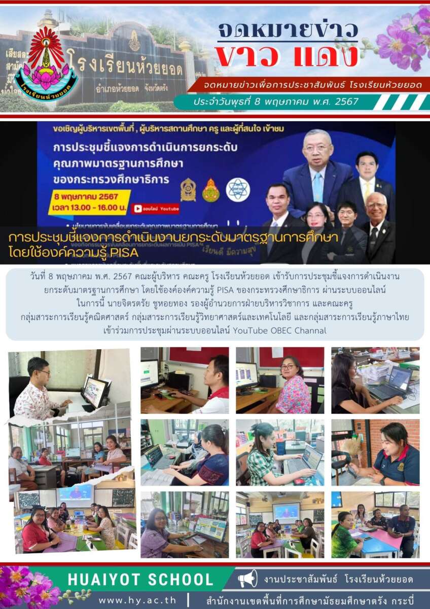 วันที่ 8 พฤษภาคม พ.ศ. 2567 คณะผู้บริหาร คณะครู โรงเรียนห้วยยอด เข้ารับการประชุมชี้แจงการดำเนินงานยกระดับมาตรฐานการศึกษา โดยใช้องค์องค์ความรู้ PISA ของกระทรวงศึกษาธิการ ผ่านระบบออนไลน์ในการนี้ นายจิตรตรัย ชูหอยทอง รองผู้อำนวยการฝ่ายบริหารวิชาการ และคณะครูกลุ่มสาระการเรียนรู้คณิตศาสตร์ กลุ่มสาระการเรียนรู้วิทยาศาสตร์และเทคโนโลยี และกลุ่มสาระการเรียนรู้ภาษาไทยเข้าร่วมการประชุมผ่านระบบออนไลน์ YouTube OBEC Channal