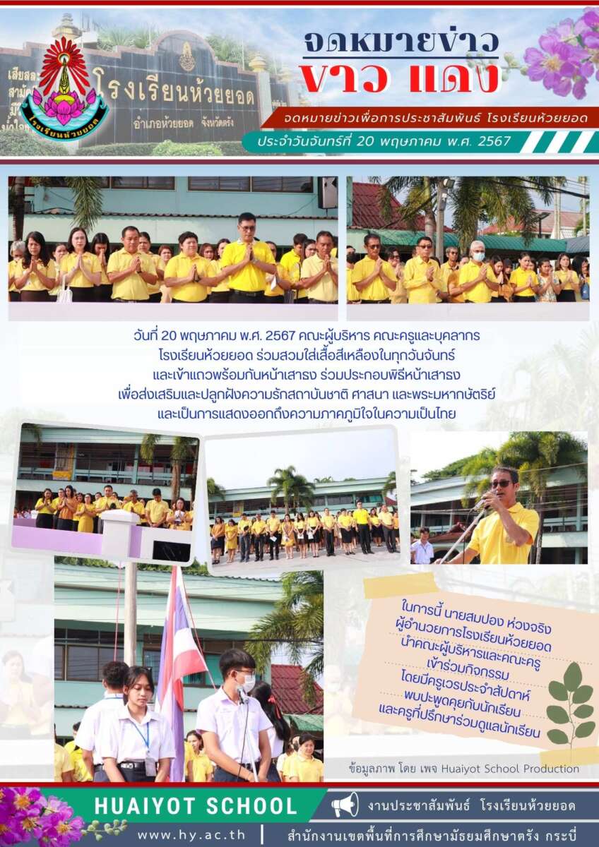 วันที่ 20 พฤษภาคม พ.ศ. 2567 คณะผู้บริหาร คณะครูและบุคลากรโรงเรียนห้วยยอดร่วมสวมใส่เสื้อสีเหลืองในทุกวันจันทร์และเข้าแถวพร้อมกันหน้าเสาธง ร่วมประกอบพิธีหน้าเสาธงเพื่อส่งเสริมและปลูกฝังความรักสถาบันชาติ ศาสนา และพระมหากษัตริย์และเป็นการแสดงออกถึงความภาคภูมิใจในความเป็นไทย