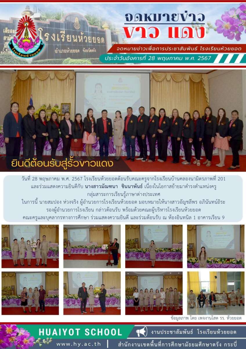 วันที่ 28 พฤษภาคม พ.ศ. 2567 โรงเรียนห้วยยอดต้อนรับคณะครูจากโรงเรียนบ้านคลองนามิตรภาพที่ 201 และร่วมแสดงความยินดีกับ นางสาวมัณฑนา ชินนาพันธ์ เนื่องในโอกาสย้ายมาดำรงตำแหน่งครู กลุ่มสาระการเรียนรู้ภาษาต่างประเทศ ในการนี้ นายสมปอง ห่วงจริง ผู้อำนวยการโรงเรียนห้วยยอด มอบหมายให้นางสาวอัญชลีพร อภินันทน์ถิระ รองผู้อำนวยการโรงเรียน กล่าวต้อนรับ พร้อมด้วยคณะผู้บริหารโรงเรียนห้วยยอด คณะครูและบุคลากรทางการศึกษา ร่วมแสดงความยินดี และร่วมต้อนรับ ณ ห้องอินทนิล 1 อาคารเรียน 9