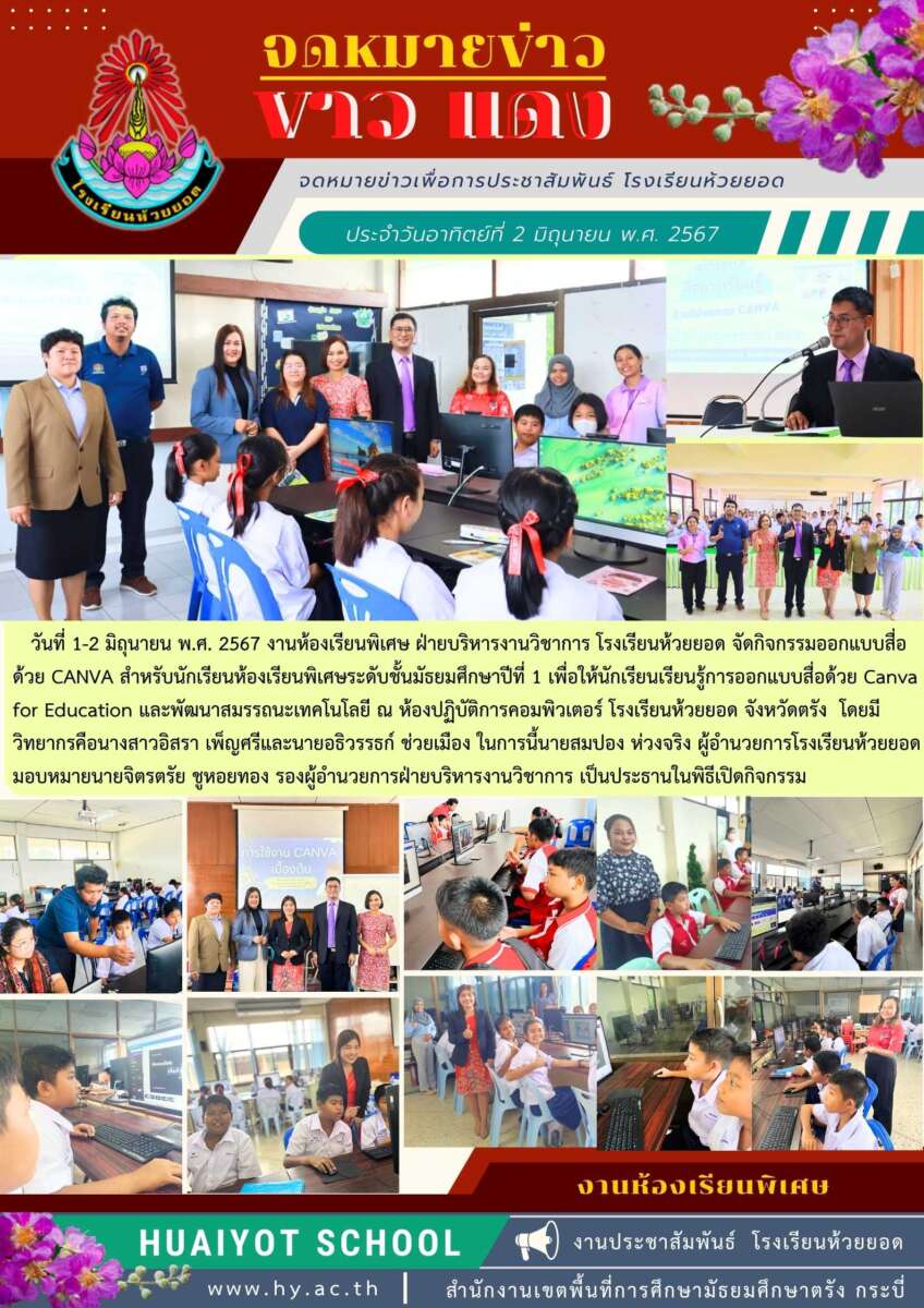 วันที่ 1-2 มิถุนายน พ.ศ. 2567 งานห้องเรียนพิเศษ ฝ่ายบริหารงานวิชาการ โรงเรียนห้วยยอด จัดกิจกรรมออกแบบสื่อด้วย CANVA สำหรับนักเรียนห้องเรียนพิเศษระดับชั้นมัธยมศึกษาปีที่ 1 เพื่อให้นักเรียนเรียนรู้การออกแบบสื่อด้วย Canva for Education และพัฒนาสมรรถนะเทคโนโลยี ณ ห้องปฏิบัติการคอมพิวเตอร์ โรงเรียนห้วยยอด จังหวัดตรัง โดยมีวิทยากรคือนางสาวอิสรา เพ็ญศรีและนายอธิวรรธก์ ช่วยเมือง ในการนี้นายสมปอง ห่วงจริง ผู้อำนวยการโรงเรียนห้วยยอด มอบหมายนายจิตรตรัย ชูหอยทอง รองผู้อำนวยการฝ่ายบริหารงานวิชาการ เป็นประธานในพิธีเปิดกิจกรรม