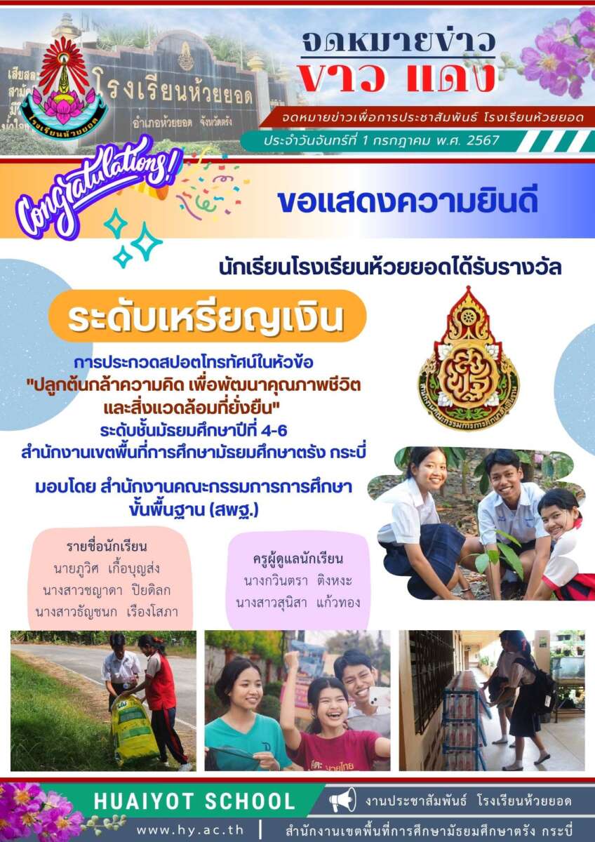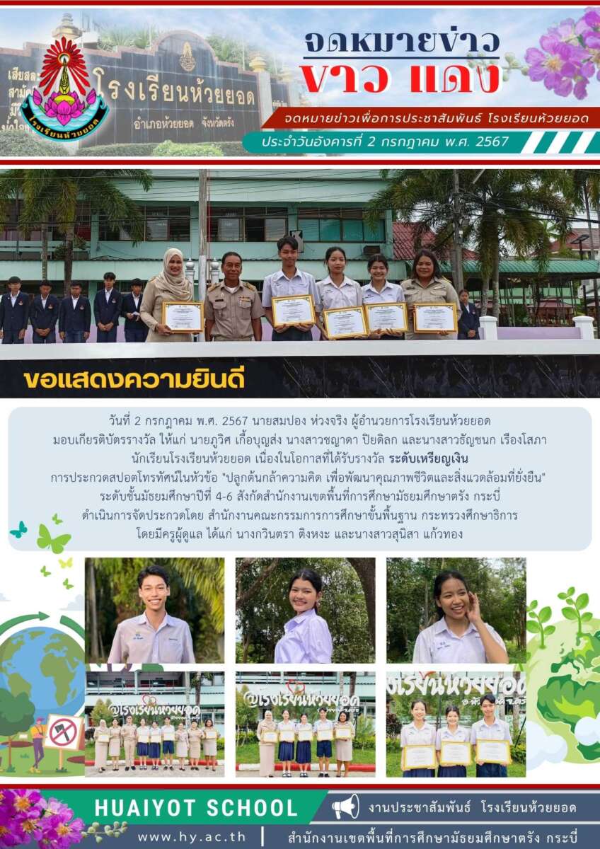 วันที่ 2 กรกฎาคม พ.ศ. 2567 นายสมปอง ห่วงจริง ผู้อำนวยการโรงเรียนห้วยยอด มอบเกียรติบัตรรางวัล ให้แก่ นายภูวิศ เกื้อบุญส่ง นางสาวชญาดา ปิยดิลก และนางสาวธัญชนก เรืองโสภา นักเรียนโรงเรียนห้วยยอด เนื่องในโอกาสที่ได้รับรางวัล ระดับเหรียญเงิน การประกวดสปอตโทรทัศน์ในหัวข้อ “ปลูกต้นกล้าความคิด เพื่อพัฒนาคุณภาพชีวิตและสิ่งแวดล้อมที่ยั่งยืน” ระดับชั้นมัธยมศึกษาปีที่ 4-6 สังกัดสำนักงานเขตพื้นที่การศึกษามัธยมศึกษาตรัง กระบี่ ดำเนินการจัดประกวดโดย สำนักงานคณะกรรมการการศึกษาขั้นพื้นฐาน กระทรวงศึกษาธิการ โดยมีครูผู้ดูแล ได้แก่ นางกวินตรา ติงหงะ และนางสาวสุนิสา แก้วทอง