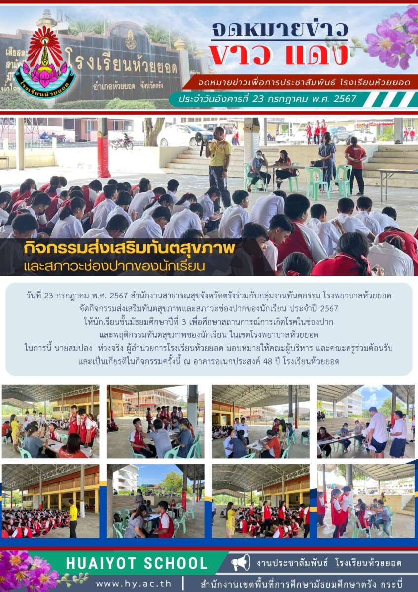 วันที่ 23 กรกฎาคม พ.ศ. 2567 สำนักงานสาธารณสุขจังหวัดตรังร่วมกับกลุ่มงานทันตกรรม โรงพยาบาลห้วยยอด จัดกิจกรรมส่งเสริมทันตสุขภาพและสภาวะช่องปากของนักเรียน ประจำปี 2567 ให้นักเรียนชั้นมัธยมศึกษาปีที่ 3 เพื่อศึกษาสถานการณ์การเกิดโรคในช่องปากและพฤติกรรมทันตสุขภาพของนักเรียน ในเขตโรงพยาบาลห้วยยอด ในการนี้ นายสมปอง ห่วงจริง ผู้อำนวยการโรงเรียนห้วยยอด มอบหมายให้คณะผู้บริหาร และคณะครูร่วมต้อนรับ และเป็นเกียรติในกิจกรรมครั้งนี้ ณ อาคารอเนกประสงค์ 48 ปี โรงเรียนห้วยยอด