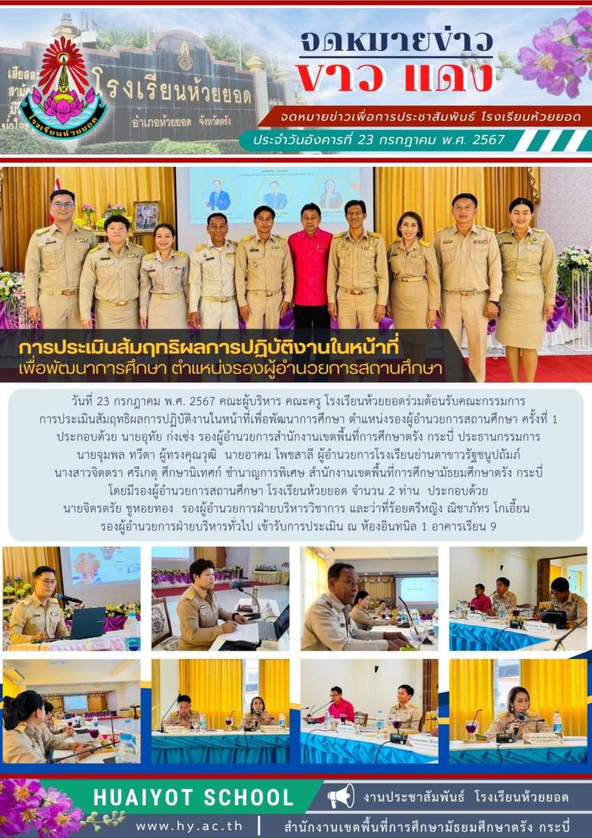 วันที่ 23 กรกฎาคม พ.ศ. 2567 คณะผู้บริหาร คณะครู โรงเรียนห้วยยอดร่วมต้อนรับคณะกรรมการการประเมินสัมฤทธิผลการปฏิบัติงานในหน้าที่เพื่อพัฒนาการศึกษา ตำแหน่งรองผู้อำนวยการสถานศึกษา ครั้งที่ 1 ประกอบด้วย นายอุทัย ก่งเซ่ง รองผู้อำนวยการสำนักงานเขตพื้นที่การศึกษาตรัง กระบี่ ประธานกรรมการนายจุมพล ทวีตา ผู้ทรงคุณวุฒิ นายอาคม โพชสาลี ผู้อำนวยการโรงเรียนย่านตาขาวรัฐชนูปถัมภ์ นางสาวจิตตรา ศรีเกตุ ศึกษานิเทศก์ ชำนาญการพิเศษ สำนักงานเขตพื้นที่การศึกษามัธยมศึกษาตรัง กระบี่ โดยมีรองผู้อำนวยการสถานศึกษา โรงเรียนห้วยยอด จำนวน 2 ท่าน ประกอบด้วย นายจิตรตรัย ชูหอยทอง รองผู้อำนวยการฝ่ายบริหารวิชาการ และว่าที่ร้อยตรีหญิง ณิชาภัทร โกเอี้ยน รองผู้อำนวยการฝ่ายบริหารทั่วไป เข้ารับการประเมิน ณ ห้องอินทนิล 1 อาคารเรียน 9