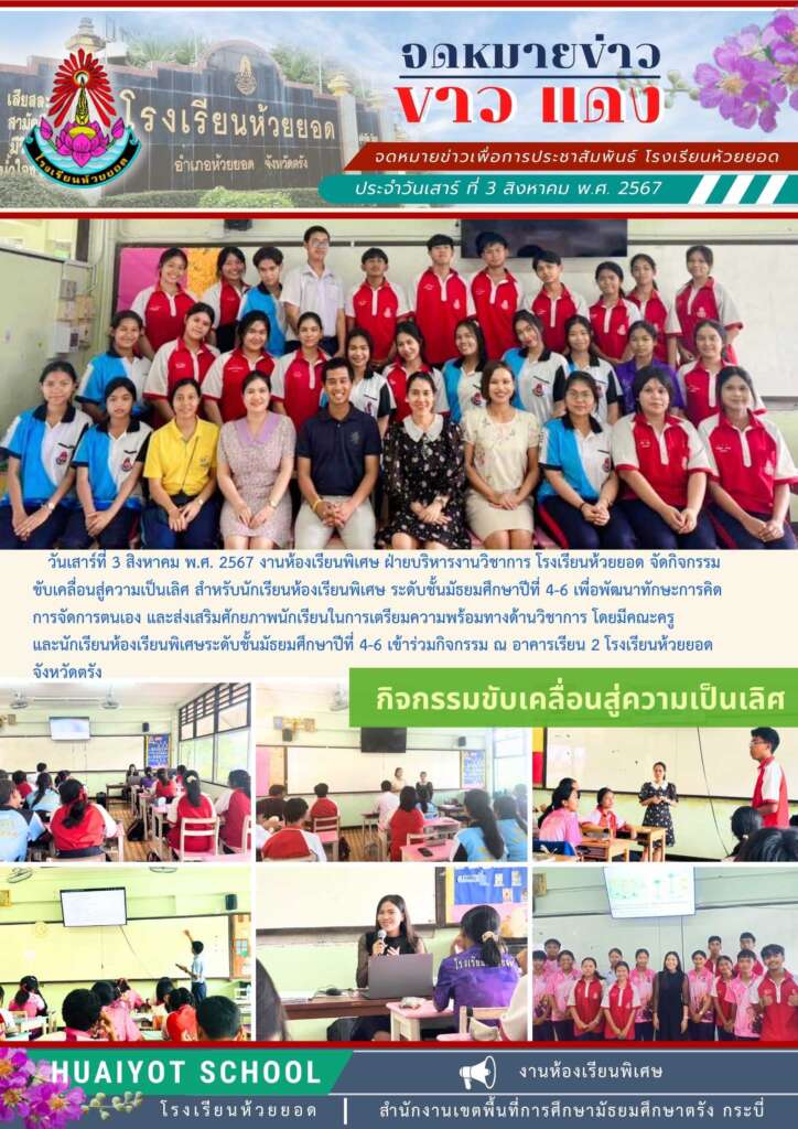 วันเสาร์ที่ 3 สิงหาคม พ.ศ. 2567 งานห้องเรียนพิเศษ ฝ่ายบริหารงานวิชาการ โรงเรียนห้วยยอด จัดกิจกรรม ขับเคลื่อนสู่ความเป็นเลิศ สำหรับนักเรียนห้องเรียนพิเศษ ระดับชั้นมัธยมศึกษาปีที่ 4-6 เพื่อพัฒนาทักษะการคิด การจัดการตนเอง และส่งเสริมศักยภาพนักเรียนในการเตรียมความพร้อมทางด้านวิชาการ โดยมีคณะครู และนักเรียนห้องเรียนพิเศษระดับชั้นมัธยมศึกษาปีที่ 4-6 เข้าร่วมกิจกรรม ณ อาคารเรียน 2 โรงเรียนห้วยยอด จังหวัดตรัง