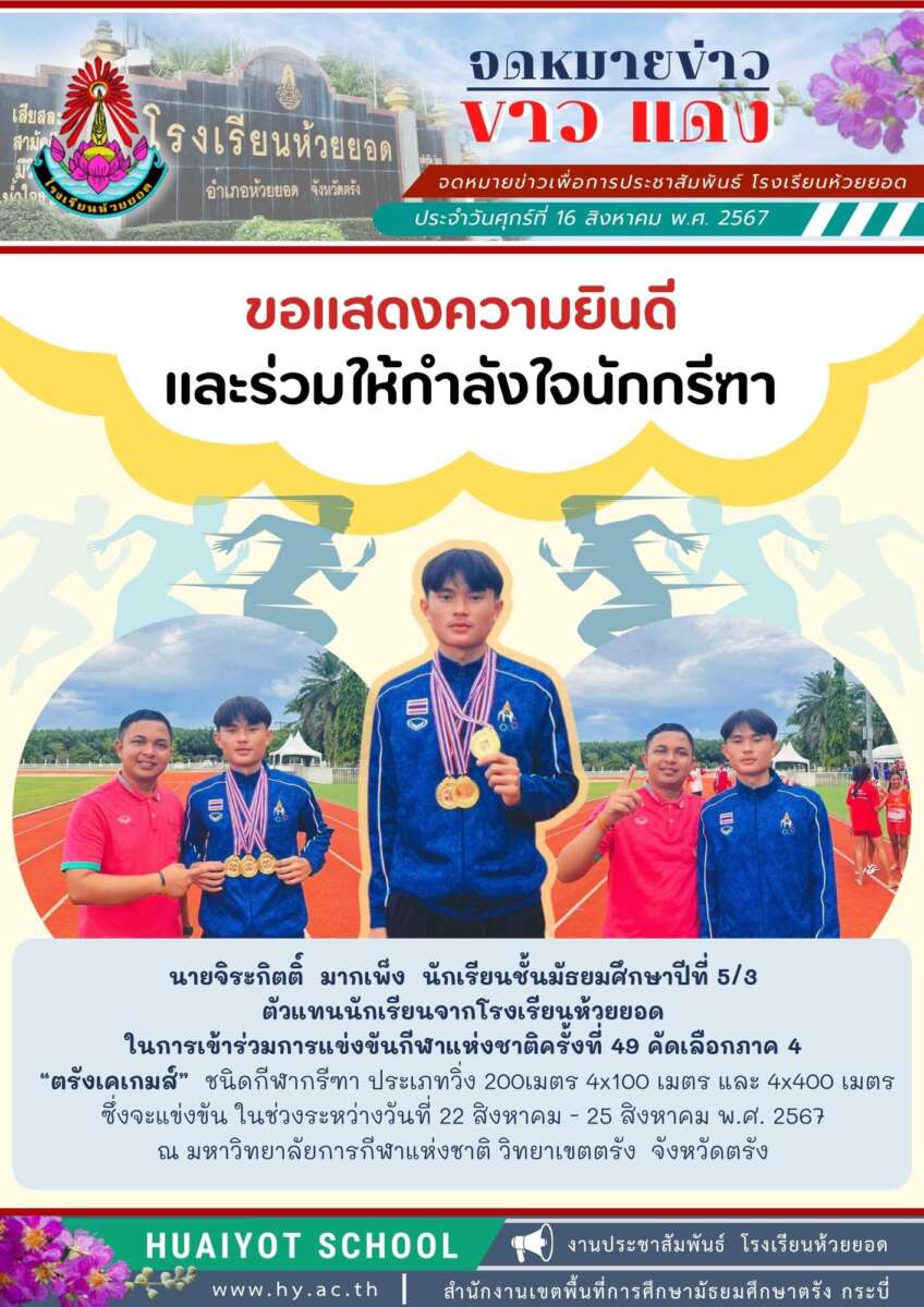 นายจิระกิตติ์ มากเพ็ง นักเรียนชั้นมัธยมศึกษาปีที่ 5/3 ตัวแทนนักเรียนจากโรงเรียนห้วยยอด ในการเข้าร่วมการแข่งขันกีฬาแห่งชาติครั้งที่ 49 คัดเลือกภาค 4 “ตรังเคเกมส์” ชนิดกีฬากรีฑา ประเภทวิ่ง 200เมตร 4×100 เมตร และ 4×400 เมตร ซึ่งจะแข่งขัน ในช่วงระหว่างวันที่ 22 สิงหาคม – 25 สิงหาคม พ.ศ. 2567 ณ มหาวิทยาลัยการกีฬาแห่งชาติ วิทยาเขตตรัง จังหวัดตรัง