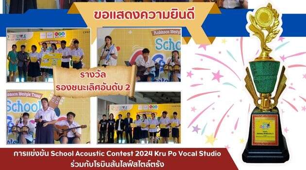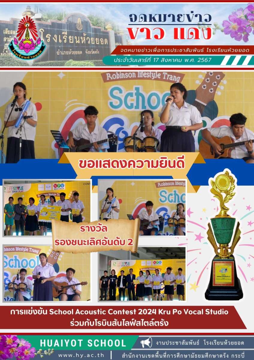 โรงเรียนห้วยยอดขอแสดงความยินดีกับนักเรียนวงดนตรีที่ได้รับรางวัลรองชนะเลิศอันดับ 2 การแข่งขัน School Acoustic Contest 2024 Kru Po Vocal Studio ร่วมกับโรบินสันไลฟ์สไตล์ตรัง