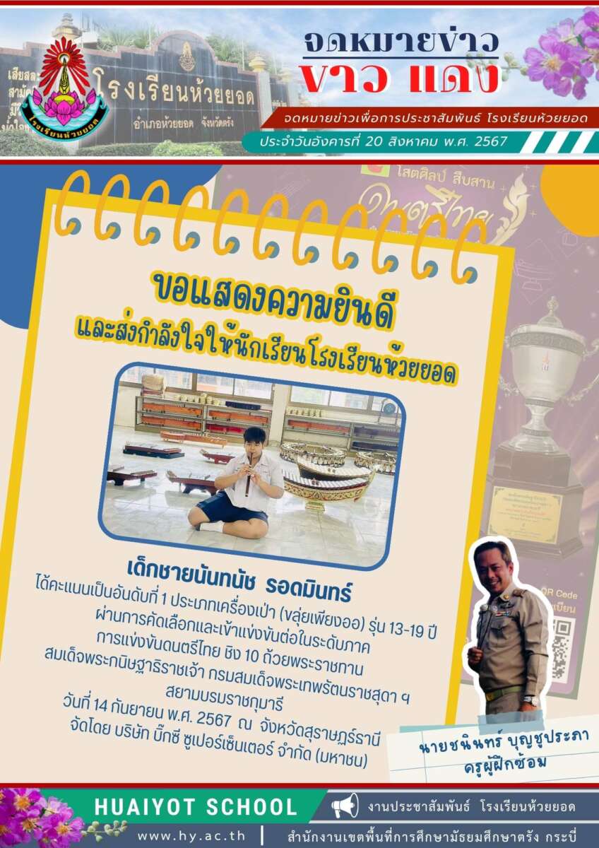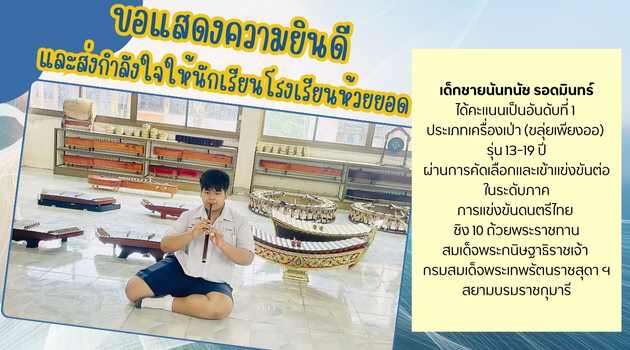 เด็กชายนันทนัช รอดมินทร์ ได้คะแนนเป็นอันดับที่ 1 ประเภทเครื่องเป่า (ขลุ่ยเพียงออ) รุ่น 13-19 ปี ผ่านการคัดเลือกและเข้าแข่งขันต่อในระดับภาค การแข่งขันดนตรีไทย ชิง 10 ถ้วยพระราชทาน สมเด็จพระกนิษฐาธิราชเจ้า กรมสมเด็จพระเทพรัตนราชสุดา ฯ สยามบรมราชกุมารี วันที่ 14 กันยายน พ.ศ. 2567 ณ จังหวัดสุราษฏร์ธานี จัดโดย บริษัท บิ๊กซี ซูเปอร์เซ็นเตอร์ จำกัด (มหาชน)