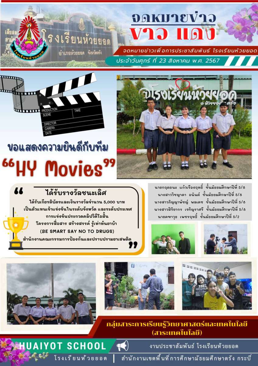 โรงเรียนห้วยยอดขอแสดงความยินดีกับทีม “HY Movies” ได้รับรางวัลชนะเลิศ ได้รับเกียรติบัตรและเงินรางวัลจำนวน 5,000 บาท เป็นตัวแทนเข้าแข่งขันในระดับจังหวัด และระดับประเทศ การแข่งขันประกวดคลิปวิดีโอสั้น โครงการสื่อสาร สร้างสรรค์ รู้เท่าทันยาบ้า (BE SMART SAY NO TO DRUGS) สำนักงานคณะกรรมการป้องกันและปราบปรามยาเสพติด