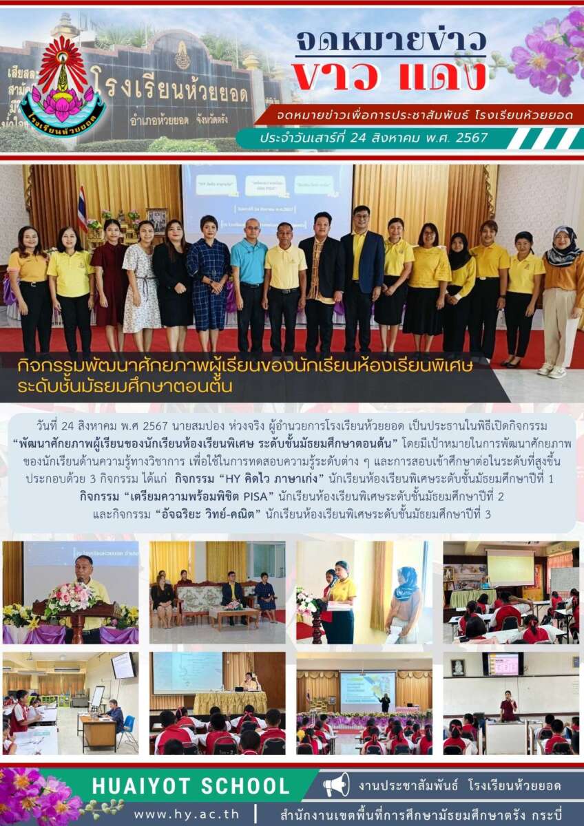 วันที่ 24 สิงหาคม พ.ศ 2567 นายสมปอง ห่วงจริง ผู้อำนวยการโรงเรียนห้วยยอด เป็นประธานในพิธีเปิดกิจกรรม “พัฒนาศักยภาพผู้เรียนของนักเรียนห้องเรียนพิเศษ ระดับชั้นมัธยมศึกษาตอนต้น” โดยมีเป้าหมายในการพัฒนาศักยภาพของนักเรียนด้านความรู้ทางวิชาการ เพื่อใช้ในการทดสอบความรู้ระดับต่าง ๆ และการสอบเข้าศึกษาต่อในระดับที่สูงขึ้น ประกอบด้วย 3 กิจกรรม ได้แก่ กิจกรรม “HY คิดไว ภาษาเก่ง” นักเรียนห้องเรียนพิเศษระดับชั้นมัธยมศึกษาปีที่ 1 กิจกรรม “เตรียมความพร้อมพิชิต PISA” นักเรียนห้องเรียนพิเศษระดับชั้นมัธยมศึกษาปีที่ 2 และกิจกรรม “อัจฉริยะ วิทย์-คณิต” นักเรียนห้องเรียนพิเศษระดับชั้นมัธยมศึกษาปีที่ 3