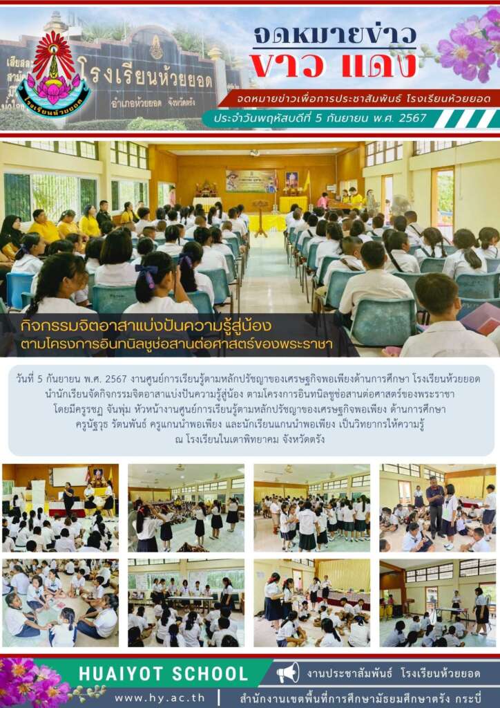 วันที่ 5 กันยายน พ.ศ. 2567 งานศูนย์การเรียนรู้ตามหลักปรัชญาของเศรษฐกิจพอเพียงด้านการศึกษา โรงเรียนห้วยยอด นำนักเรียนจัดกิจกรรมจิตอาสาแบ่งปันความรู้สู่น้อง ตามโครงการอินทนิลชูช่อสานต่อศาสตร์ของพระราชา โดยมีครูรชฏ จันพุ่ม หัวหน้างานศูนย์การเรียนรู้ตามหลักปรัชญาของเศรษฐกิจพอเพียง ด้านการศึกษา ครูนัฐวุธ รัตนพันธ์ ครูแกนนำพอเพียง และนักเรียนแกนนำพอเพียง เป็นวิทยากรให้ความรู้ ณ โรงเรียนในเตาพิทยาคม จังหวัดตรัง