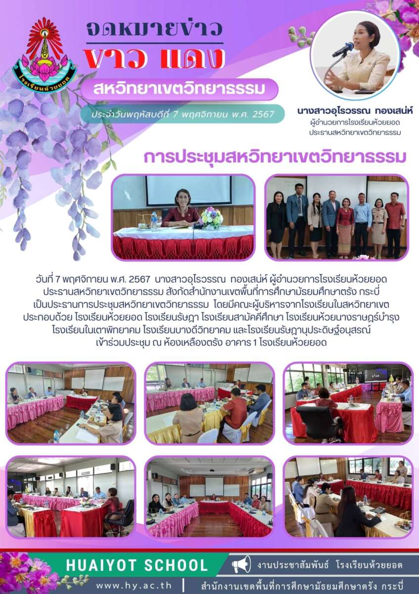 วันที่ 7 พฤศจิกายน พ.ศ. 2567 นางสาวอุไรวรรณ ทองเสน่ห์ ผู้อำนวยการโรงเรียนห้วยยอด ประธานสหวิทยาเขตวิทยาธรรม สังกัดสำนักงานเขตพื้นที่การศึกษามัธยมศึกษาตรัง กระบี่ เป็นประธานการประชุมสหวิทยาเขตวิทยาธรรม โดยมีคณะผู้บริหารจากโรงเรียนในสหวิทยาเขต ประกอบด้วย โรงเรียนห้วยยอด โรงเรียนรัษฎา โรงเรียนสามัคคีศึกษา โรงเรียนห้วยนางราษฎร์บำรุง โรงเรียนในเตาพิทยาคม โรงเรียนบางดีวิทยาคม และโรงเรียนรัษฎานุประดิษฐ์อนุสรณ์ เข้าร่วมประชุม ณ ห้องเหลืองตรัง อาคาร 1 โรงเรียนห้วยยอด