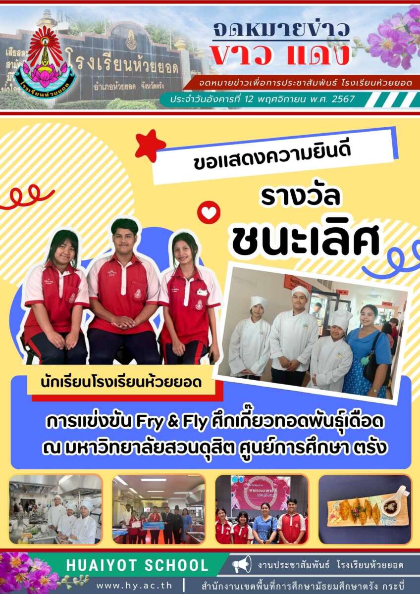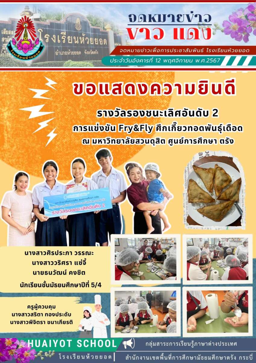 ขอแสดงความยินดีกับนักเรียนโรงเรียนห้วยยอด ได้รับรางวัลชนะเลิศ และรองชนะเลิศอันดับ 2 การแข่งขัน Fry & Fly ศึกเกี๊ยวทอดพันธุ์เดือด ณ มหาวิทยาลัยสวนดุสิต ศูนย์การศึกษา ตรัง