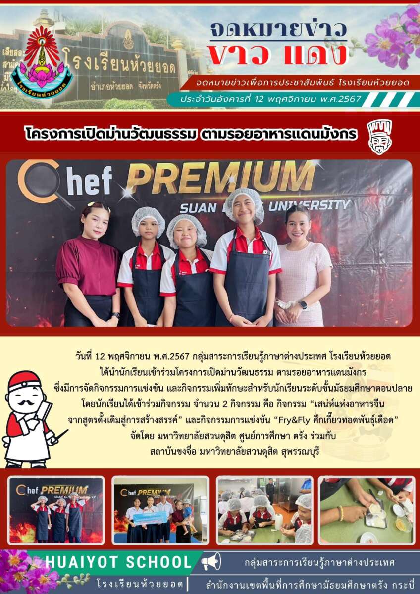 วันที่ 12 พฤศจิกายน พ.ศ.2567 กลุ่มสาระการเรียนรู้ภาษาต่างประเทศ และกลุ่มสาระการเรียนรู้การงานอาชีพ โรงเรียนห้วยยอด ได้นำนักเรียนเข้าร่วมโครงการเปิดม่านวัฒนธรรม ตามรอยอาหารแดนมังกร ซึ่งมีการจัดกิจกรรมการแข่งขัน และกิจกรรมเพิ่มทักษะสำหรับนักเรียนระดับชั้นมัธยมศึกษาตอนปลาย โดยนักเรียนได้เข้าร่วมกิจกรรม จำนวน 2 กิจกรรม คือ กิจกรรม “เสน่ห์แห่งอาหารจีน จากสูตรดั้งเดิมสู่การสร้างสรรค์” และกิจกรรมการแข่งขัน “Fry&Fly ศึกเกี๊ยวทอดพันธุ์เดือด” จัดโดย มหาวิทยาลัยสวนดุสิต ศูนย์การศึกษา ตรัง ร่วมกับสถาบันขงจื่อ มหาวิทยาลัยสวนดุสิต สุพรรณบุรี