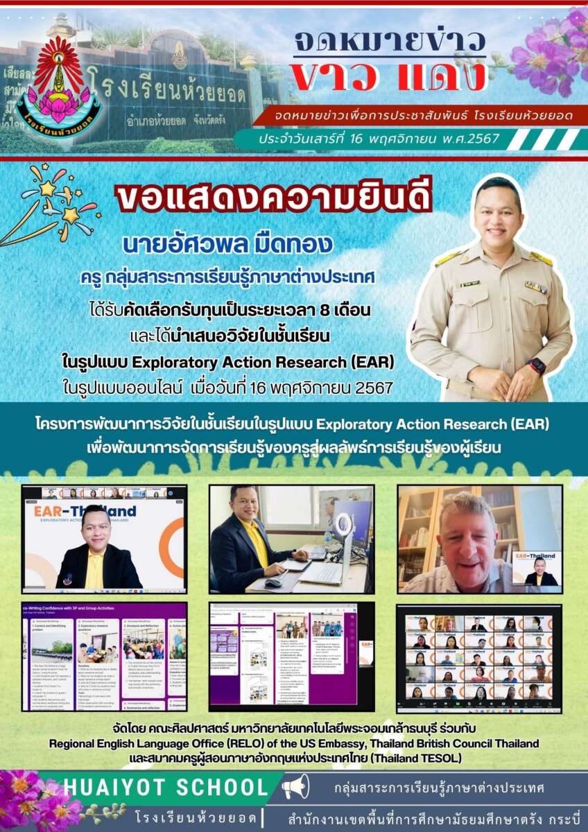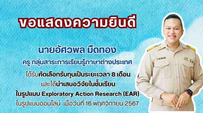 ขอแสดงความยินดีกับ นายอัศวพล มืดทอง ครู กลุ่มสาระการเรียนรู้ภาษาต่างประเทศ ได้รับคัดเลือกรับทุนเป็นระยะเวลา 8 เดือนและได้นำเสนอวิจัยในชั้นเรียนในรูปแบบ Exploratory Action Research (EAR) ในรูปแบบออนไลน์ เมื่อวันที่ 16 พฤศจิกายน 2567 โครงการพัฒนาการวิจัยในชั้นเรียนในรูปแบบ Exploratory Action Research (EAR) เพื่อพัฒนาการจัดการเรียนรู้ของครูสู่ผลลัพธ์การเรียนรู้ของผู้เรียน จัดโดย คณะศิลปศาสตร์ มหาวิทยาลัยเทคโนโลยีพระจอมเกล้าธนบุรี ร่วมกับ Regional English Language Office (RELO) of the US Embassy, Thailand British Council Thailandและสมาคมครูผู้สอนภาษาอังกฤษแห่งประเทศไทย (Thailand TESOL)