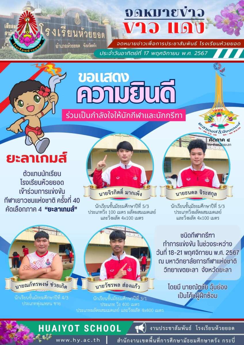 โรงเรียนห้วยยอดร่วมเป็นกำลังใจให้นักกีฬาและนักกรีฑาตัวแทนนักเรียนโรงเรียนห้วยยอดเข้าร่วมการแข่งขันกีฬาเยาวชนแห่งชาติ ครั้งที่ 40 คัดเลือกภาค 4 “ยะลาเกมส์”